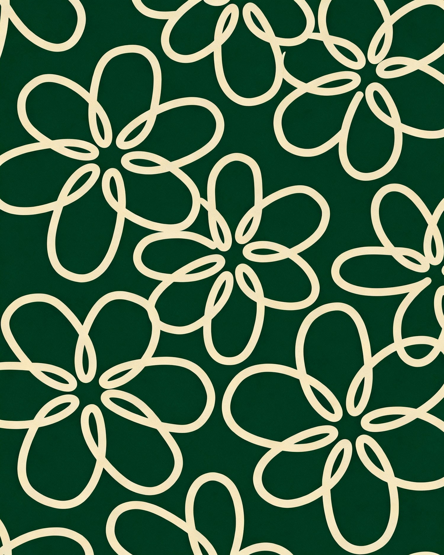 Bold minimalist floral illustration with very thick smooth monoline strokes, rounded ends, uniform line weight, hand-drawn but clean vector look, abstract flower shapes, overlapping petals, no shading, no texture, no gradients, flat colors, playful organic composition, modern graphic aesthetic. Dense repeating floral shapes, petals drawn in continuous loops, interconnected organic strokes. Layout covers the full surface like a seamless pattern. Background in a dark premium green, lines in soft cream. No variation in stroke thickness.
