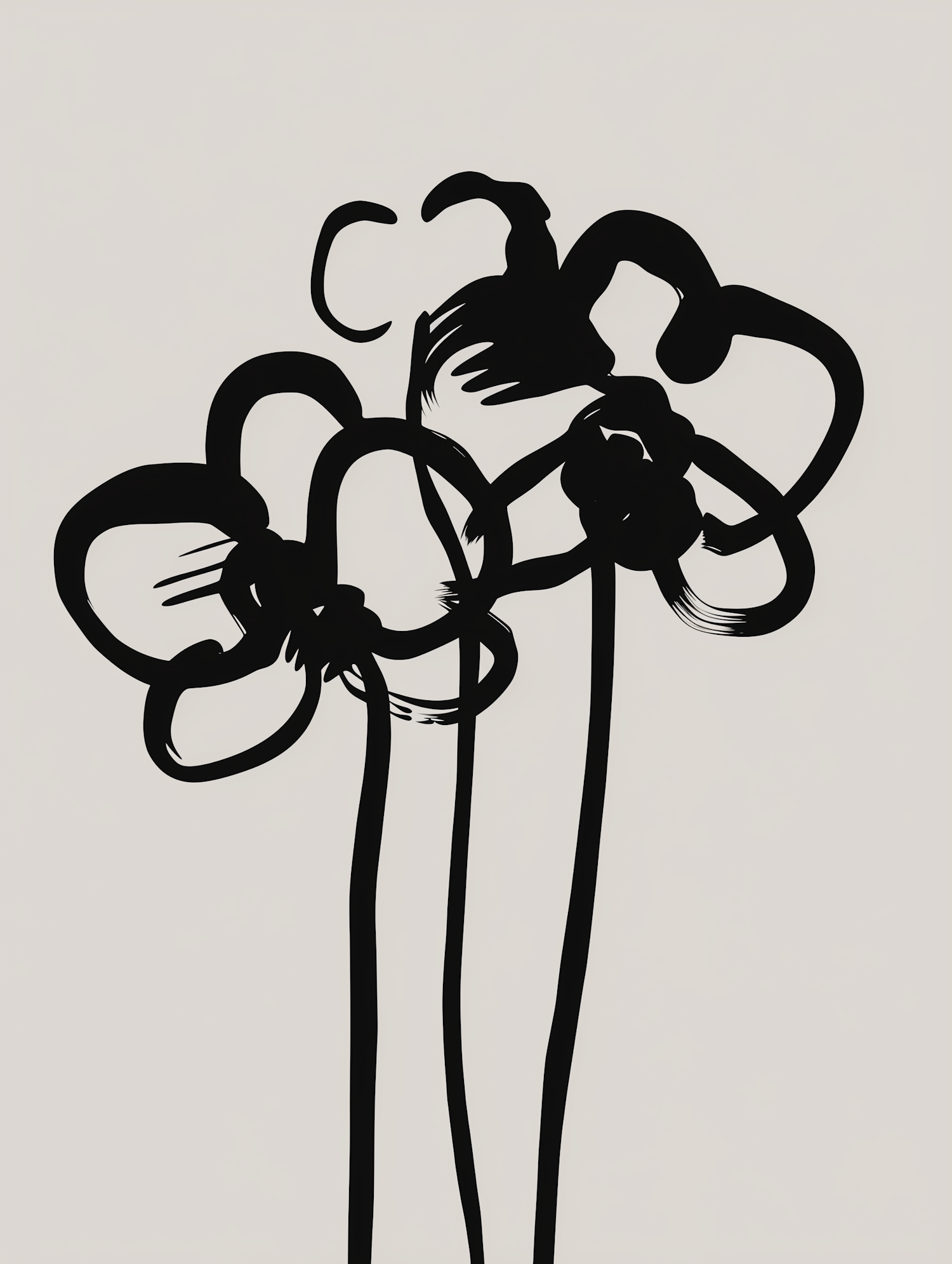 Minimalist black ink illustration of abstract flowers with bold brushstrokes on a light gray background. Modern and expressive design.