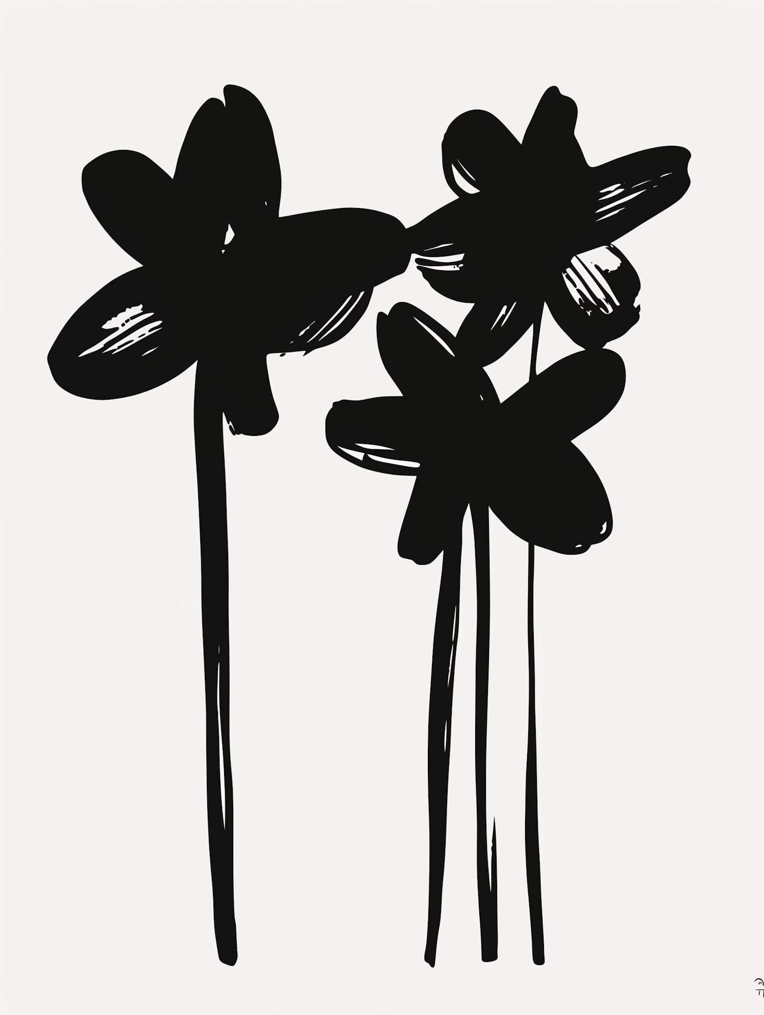 Minimalist black-and-white illustration of three abstract flowers with bold brushstrokes and elongated stems on a white background.