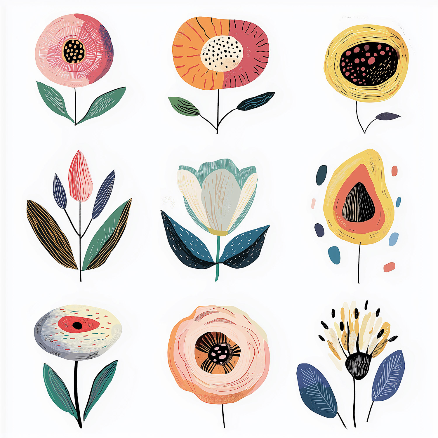 Bright and artistic floral illustration with nine unique, colorful flowers in a grid. Perfect for modern decor or design inspiration.