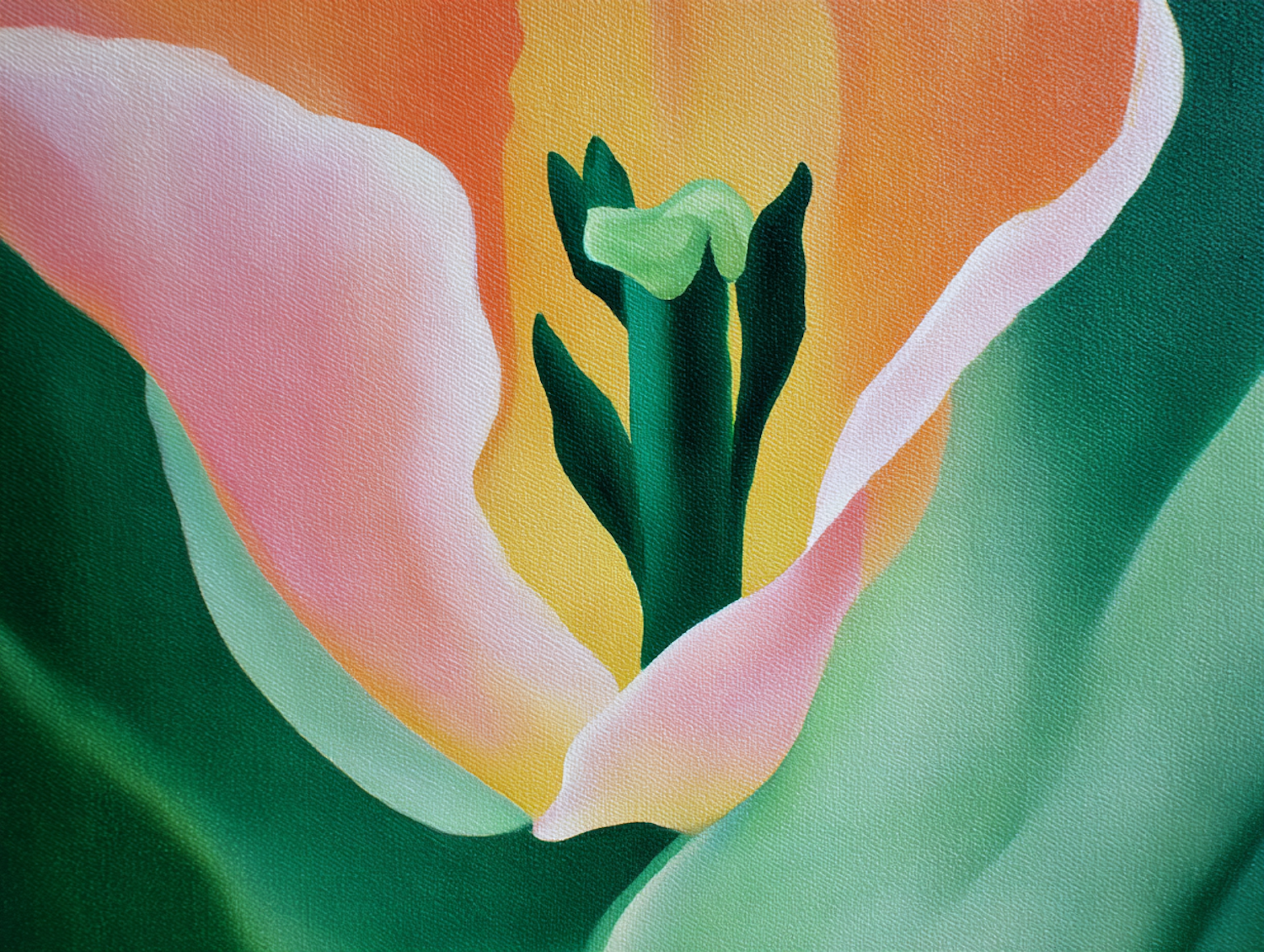 A vibrant close-up painting of a flower in pink, orange, and green tones showcasing stunning detail and texture.