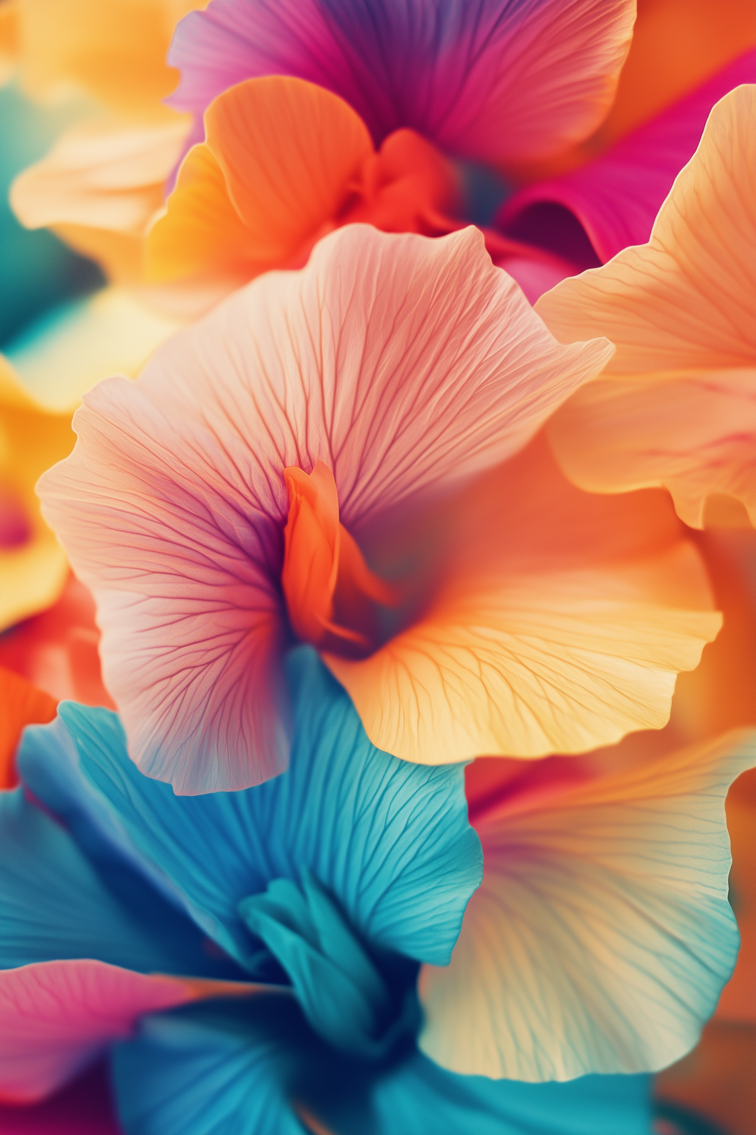Close-up of colorful abstract flower petals with vivid pink, orange, blue, and purple hues, creating a dreamy and artistic composition.