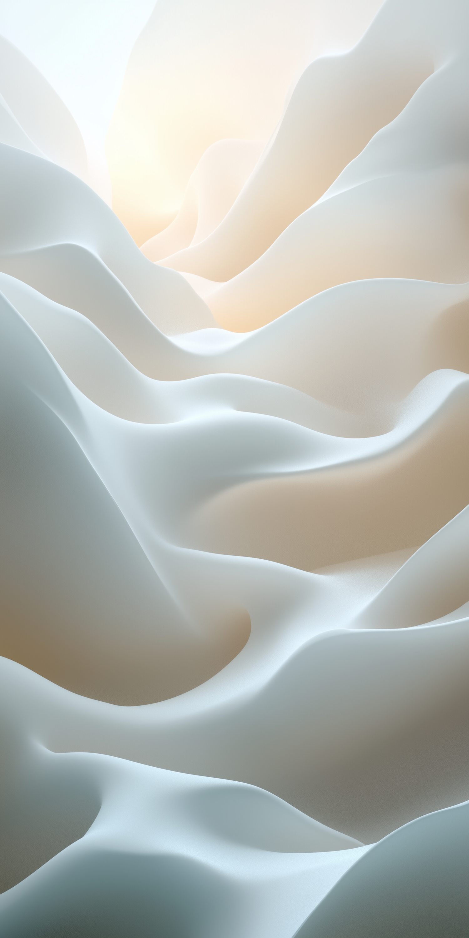 Abstract flowing shapes in soft white and beige tones, resembling dunes or waves, with a warm, glowing light in the background.