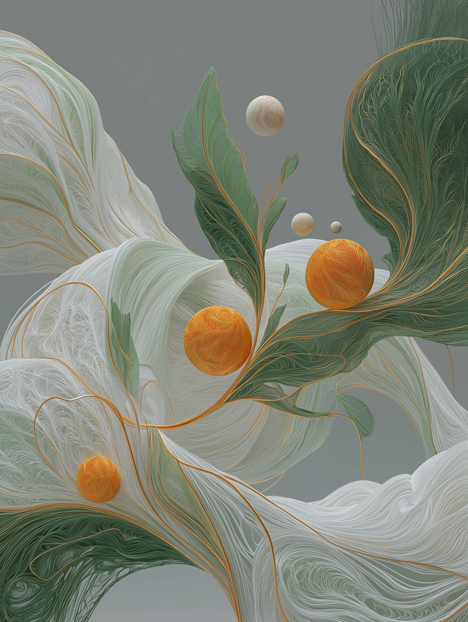 Abstract digital artwork with flowing green and white patterns, accented by vibrant orange spheres, set against a muted gray background.
