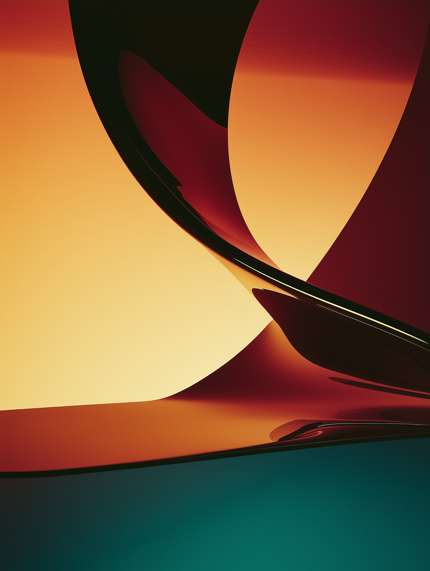Abstract image with flowing curves in warm yellow, orange, and red tones, contrasted by deep teal. Dynamic and visually engaging.