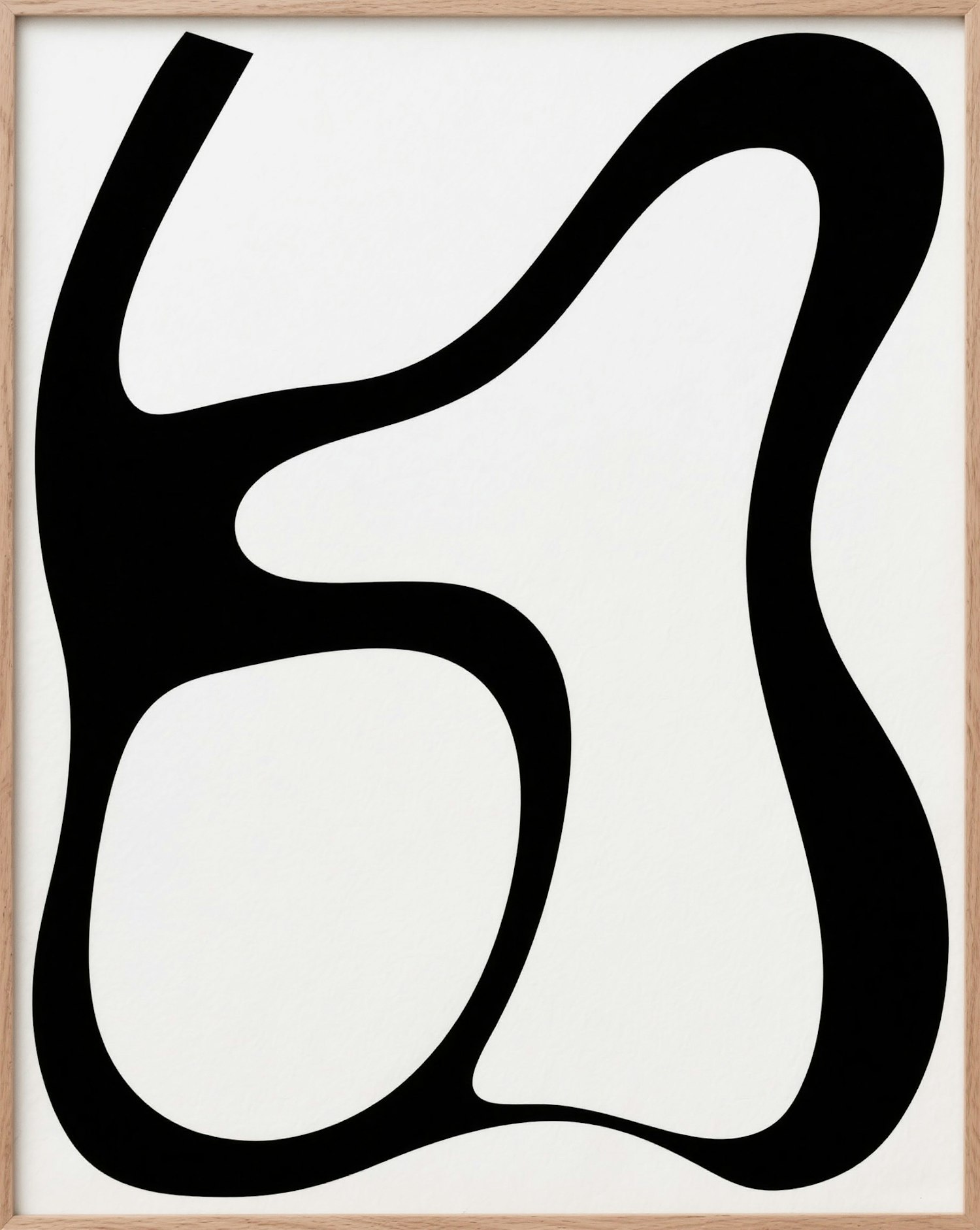 Minimalist abstract art with two black organic shapes on white, framed in a natural wood frame. Perfect for modern, clean interiors.