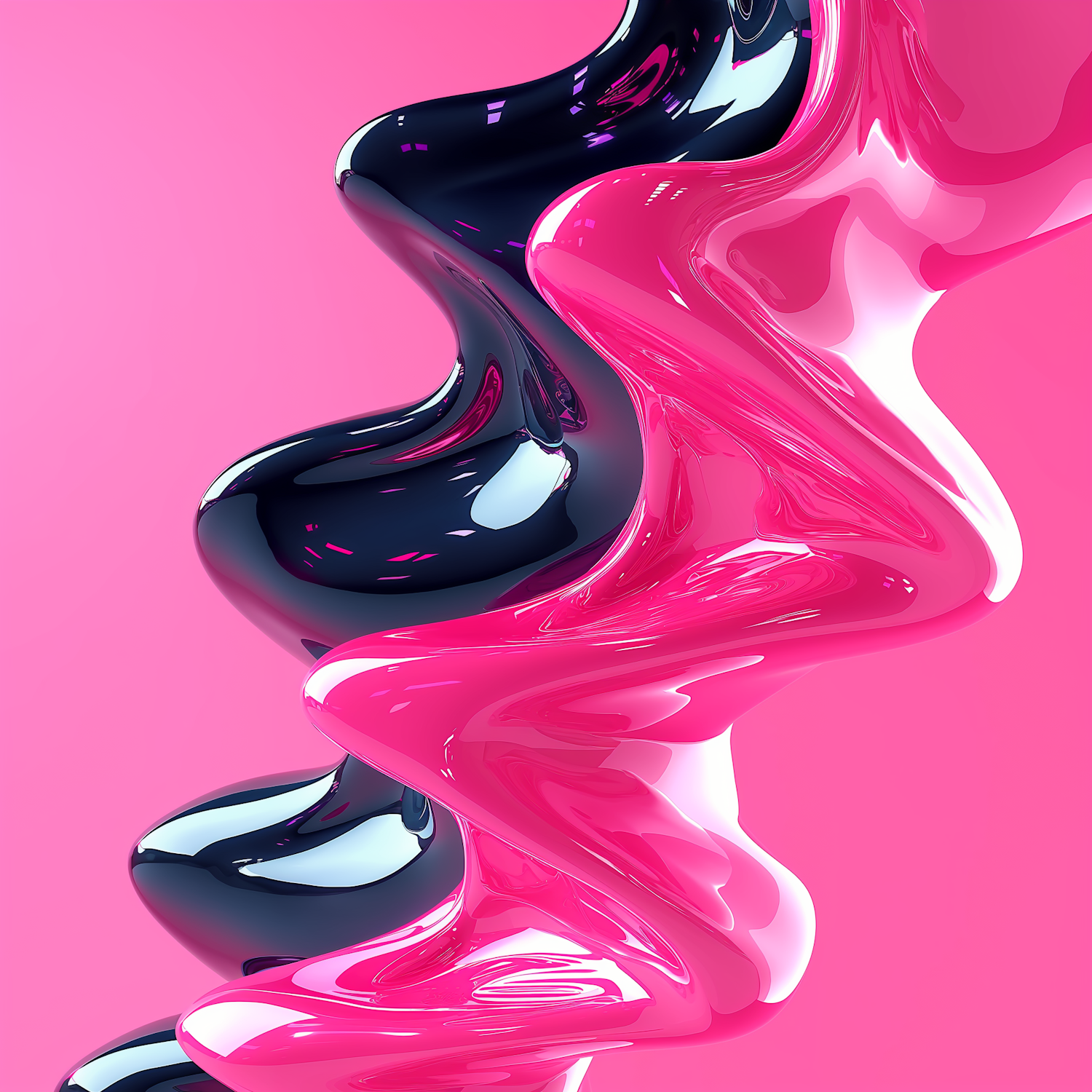 Abstract 3D rendering with glossy pink and black swirls on a pink background, creating a dynamic and modern visual effect.