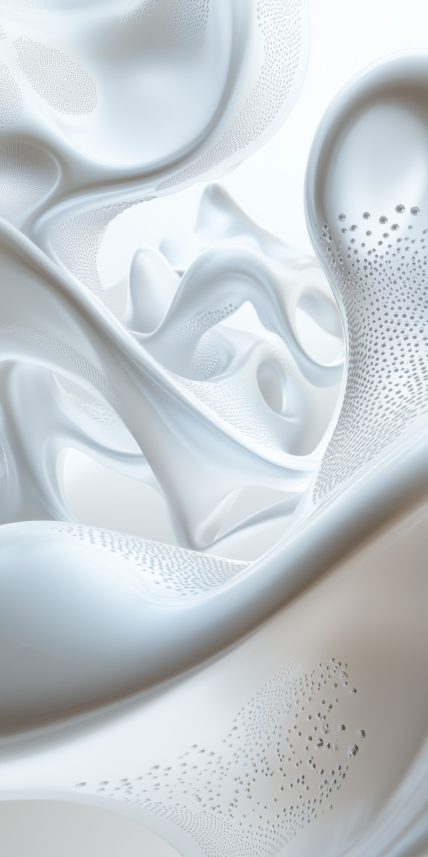 Abstract white fluid shapes with dotted textures and smooth, flowing forms, creating a dynamic and ethereal visual effect.