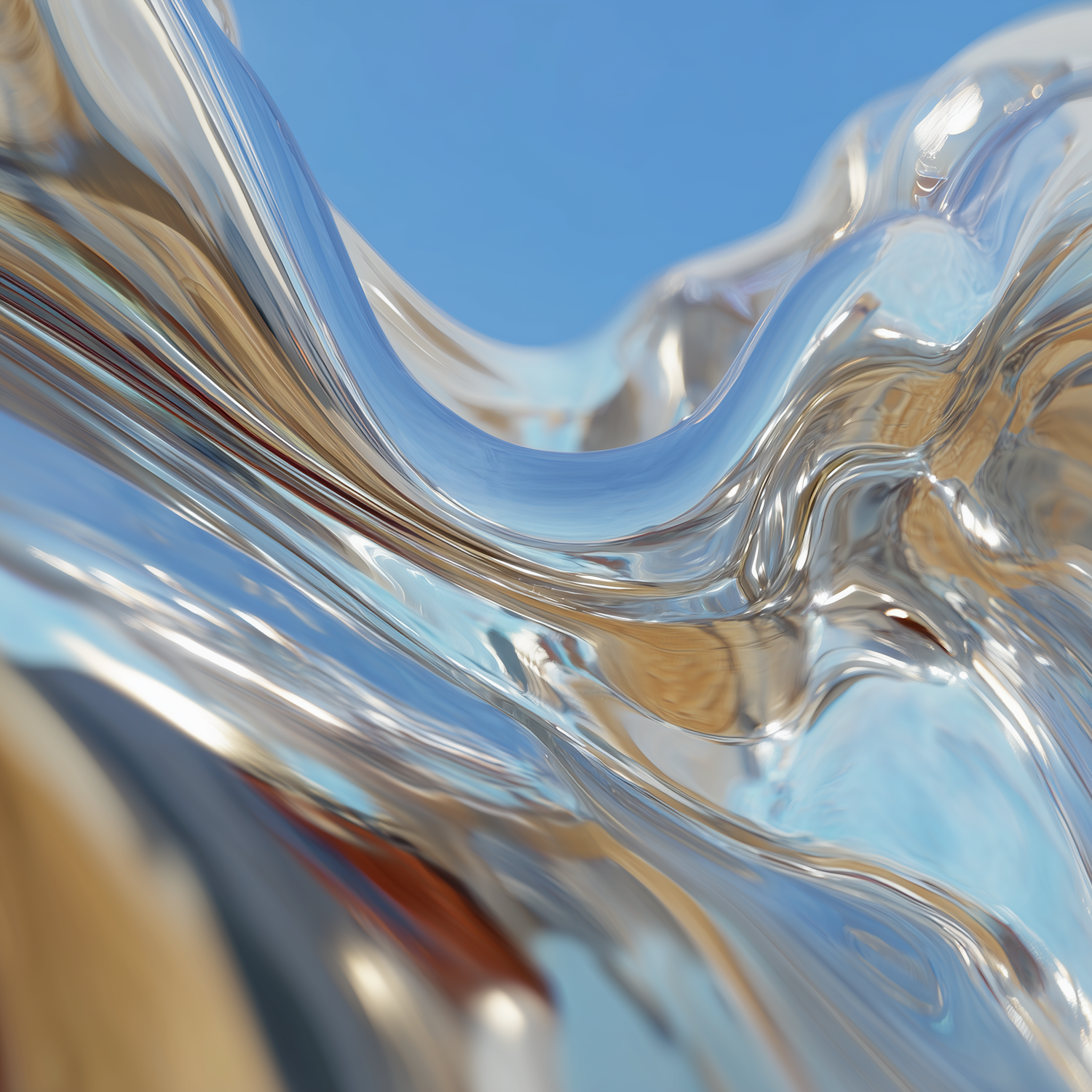 Abstract flowing metallic and glass-like shapes with a blue sky background, creating a dynamic and modern artistic composition.