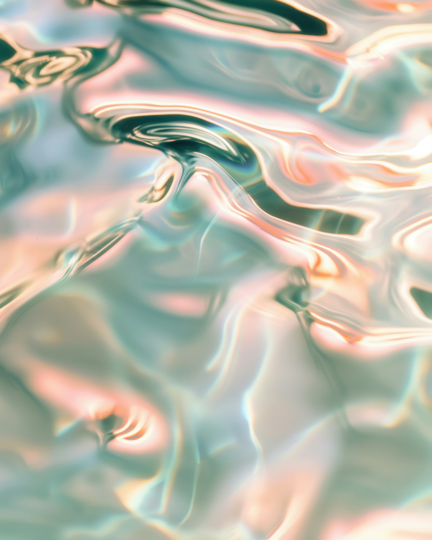 Abstract fluid patterns with pastel teal, peach, and cream tones, creating a soothing, rippling effect with light reflections.
