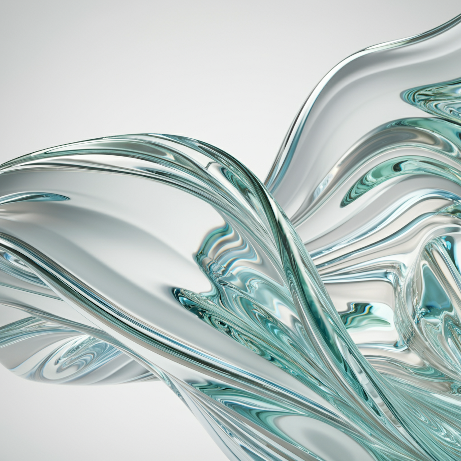 Elegant translucent swirl shapes with teal hues create a fluid, abstract design against a neutral gradient background.