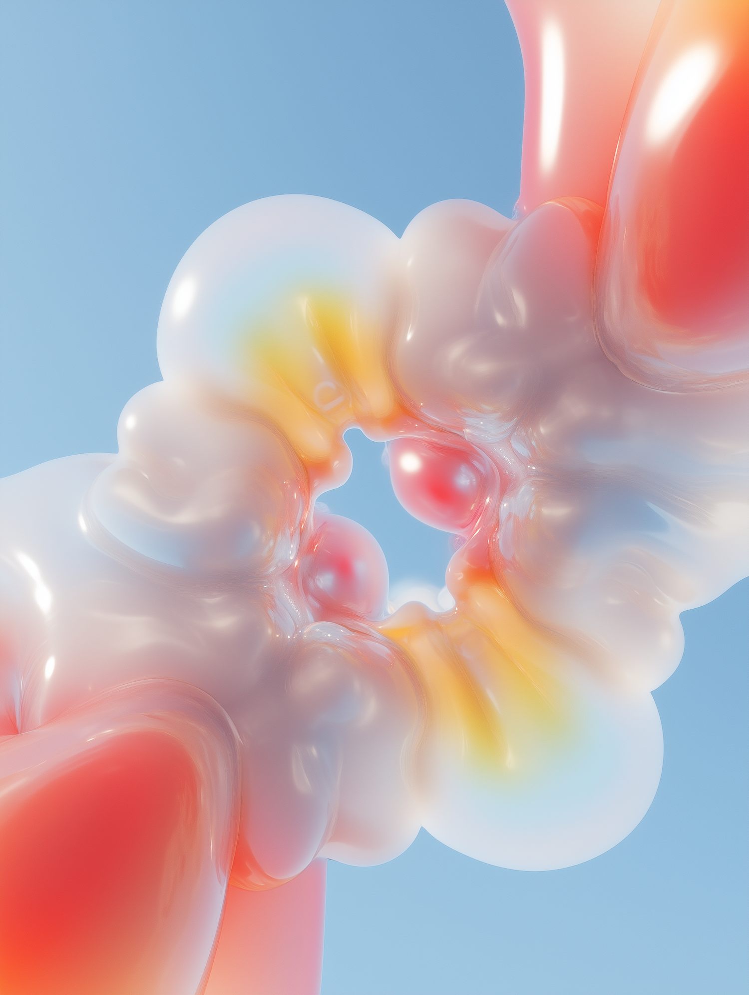 Surreal 3D abstract art with glossy, translucent forms in white, orange, and yellow against a blue sky. Dreamlike and ethereal.