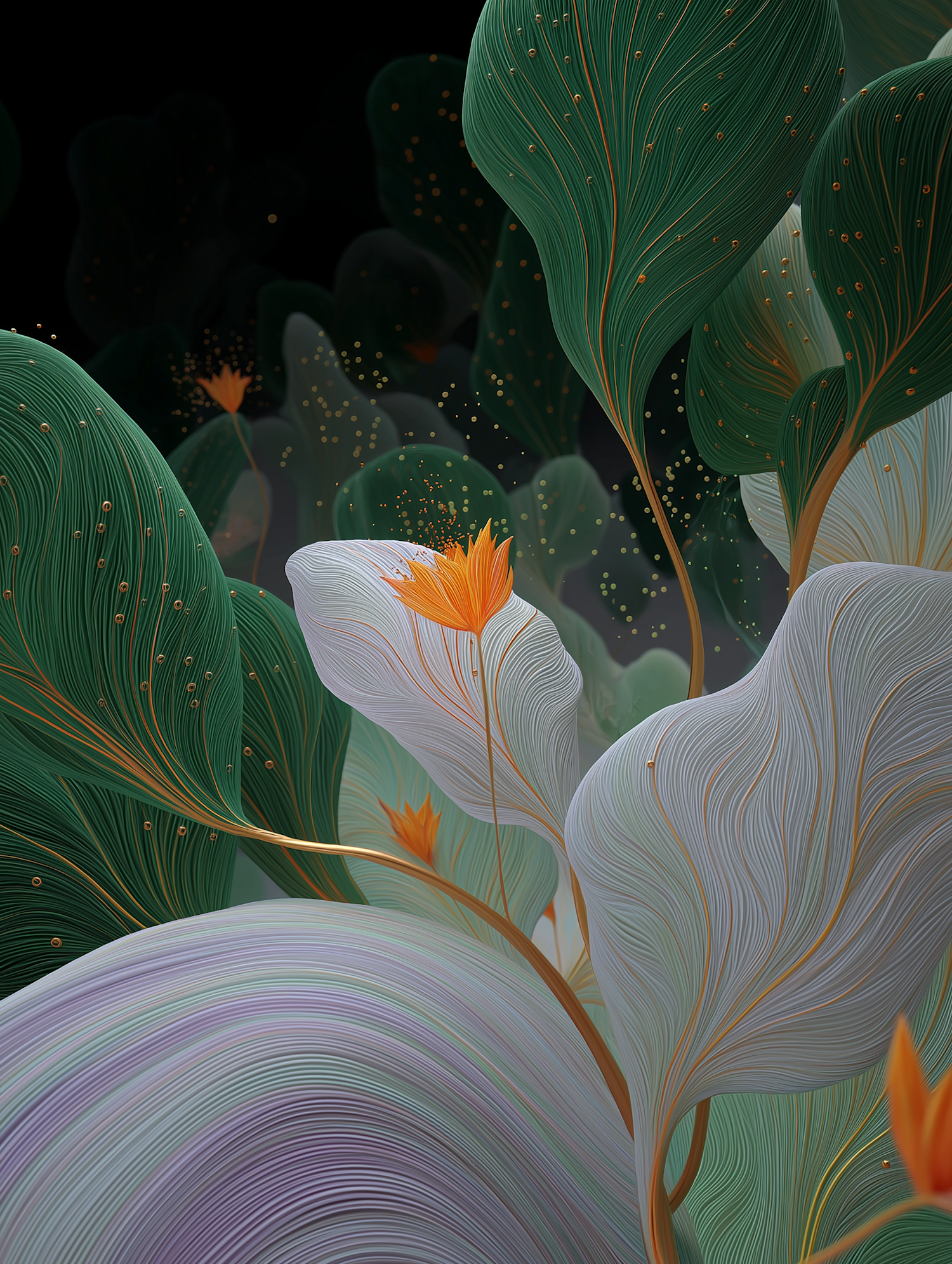 A stunning abstract artwork of vibrant green and orange foliage with intricate details, set against a dark background for contrast.