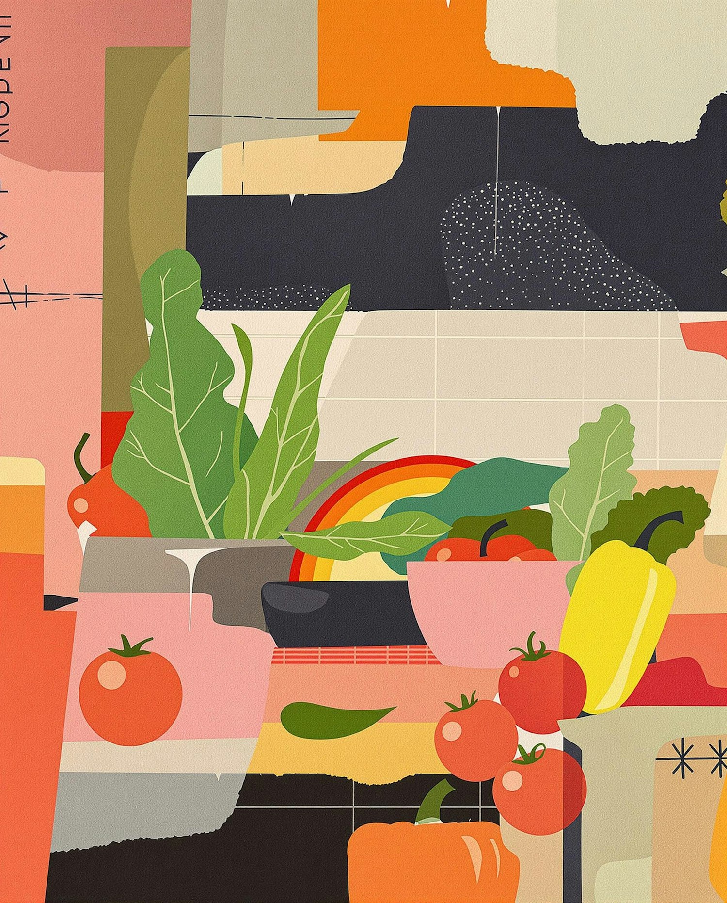 Abstract illustration of vegetables like tomatoes and peppers in a modern, colorful composition with bold shapes and textures.
