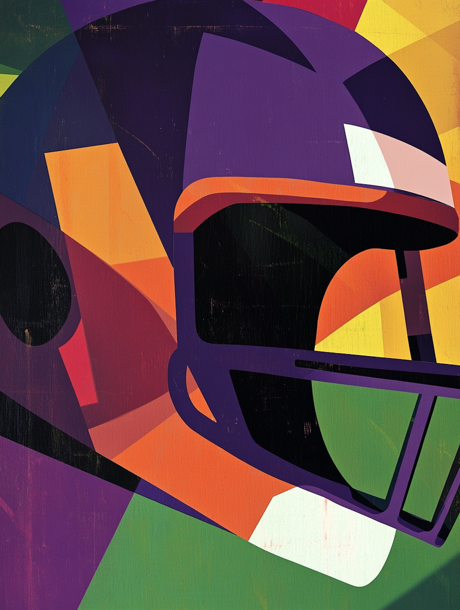 Abstract illustration of a colorful football helmet with geometric shapes and vibrant colors, creating a dynamic and modern design.