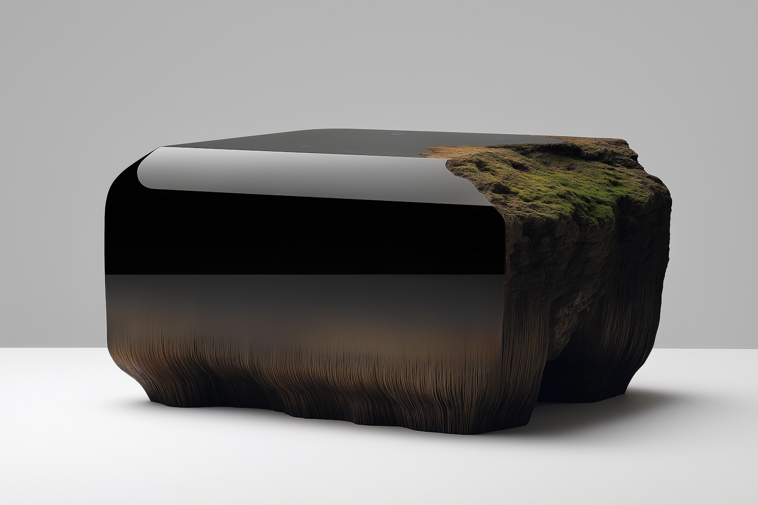 A sleek black and mossy rock-inspired sculpture blending modern and natural aesthetics, perfect for contemporary interiors.