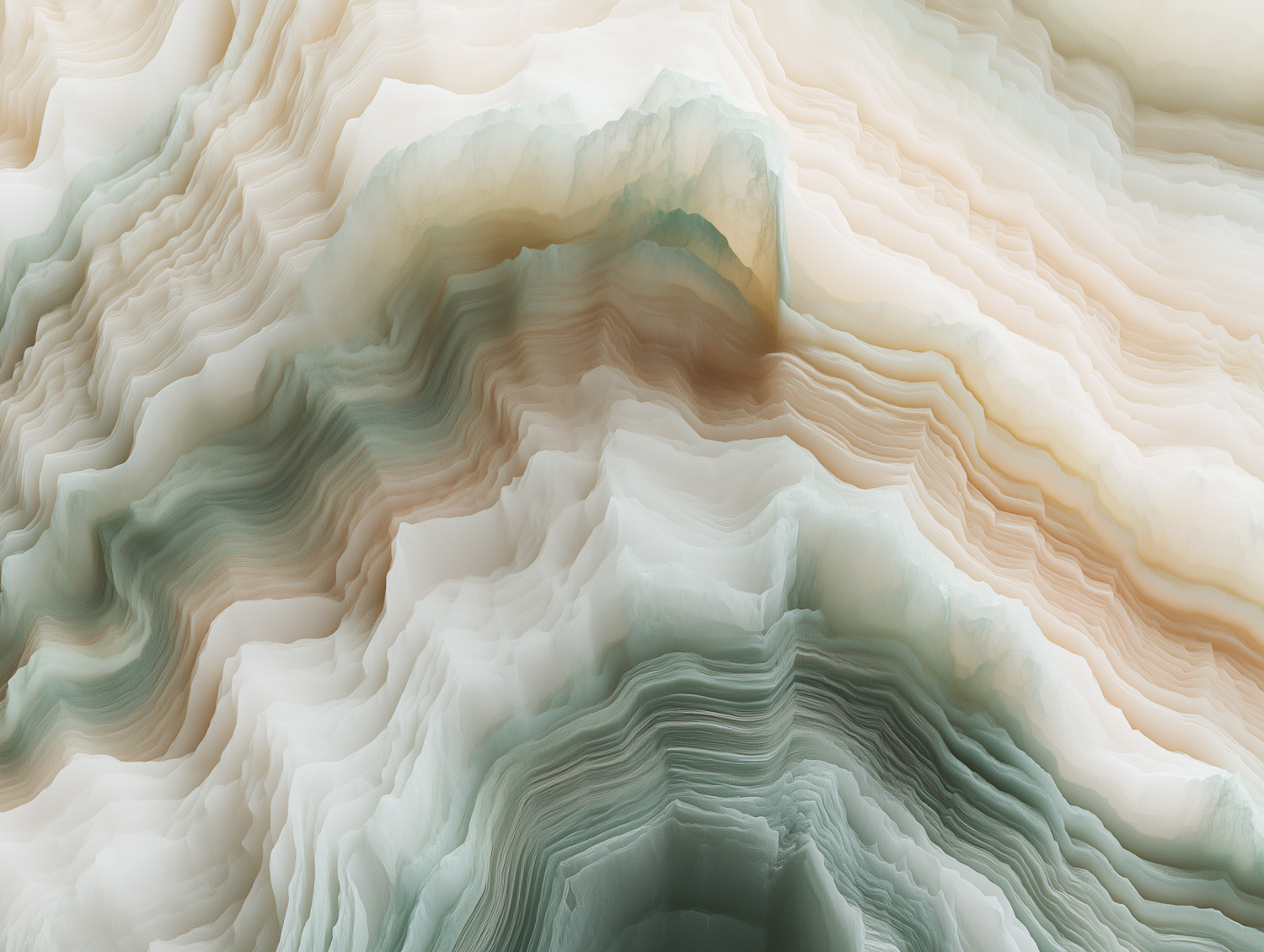 Abstract layered artwork with soft cream, beige, and green tones, resembling geological formations or flowing landscapes.