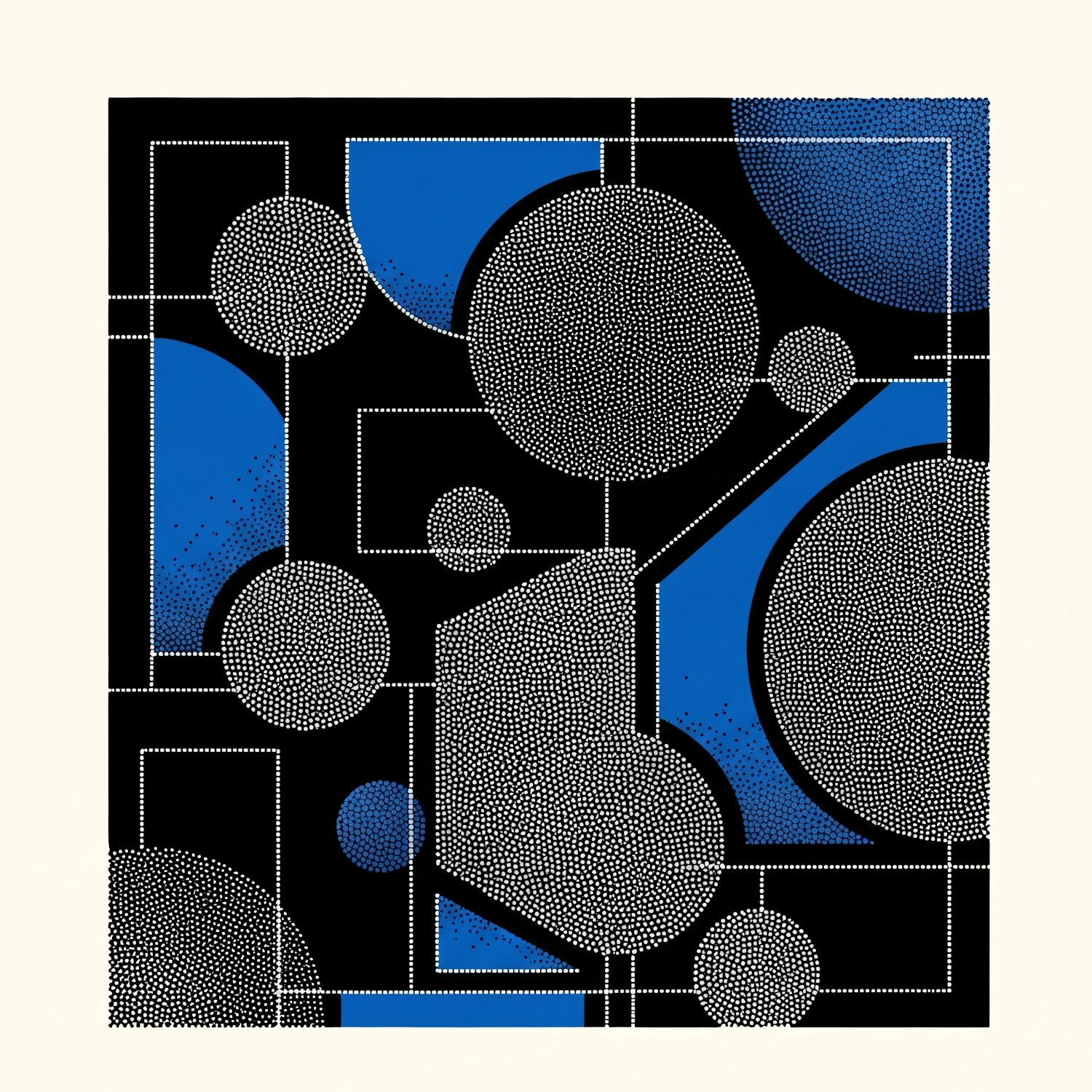 Abstract geometric artwork with black, white, and blue shapes, featuring dotted textures and a modern, minimalistic design.