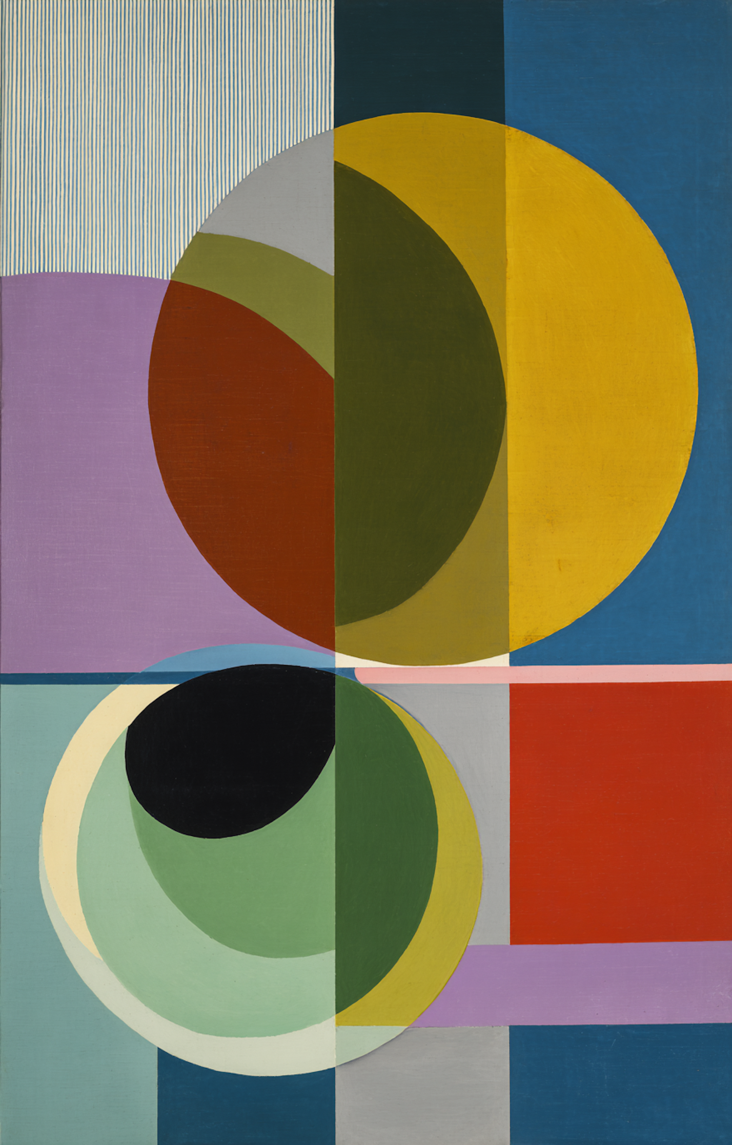 Abstract geometric painting with vibrant circles and rectangles in yellow, green, red, and blue tones, creating a dynamic composition.