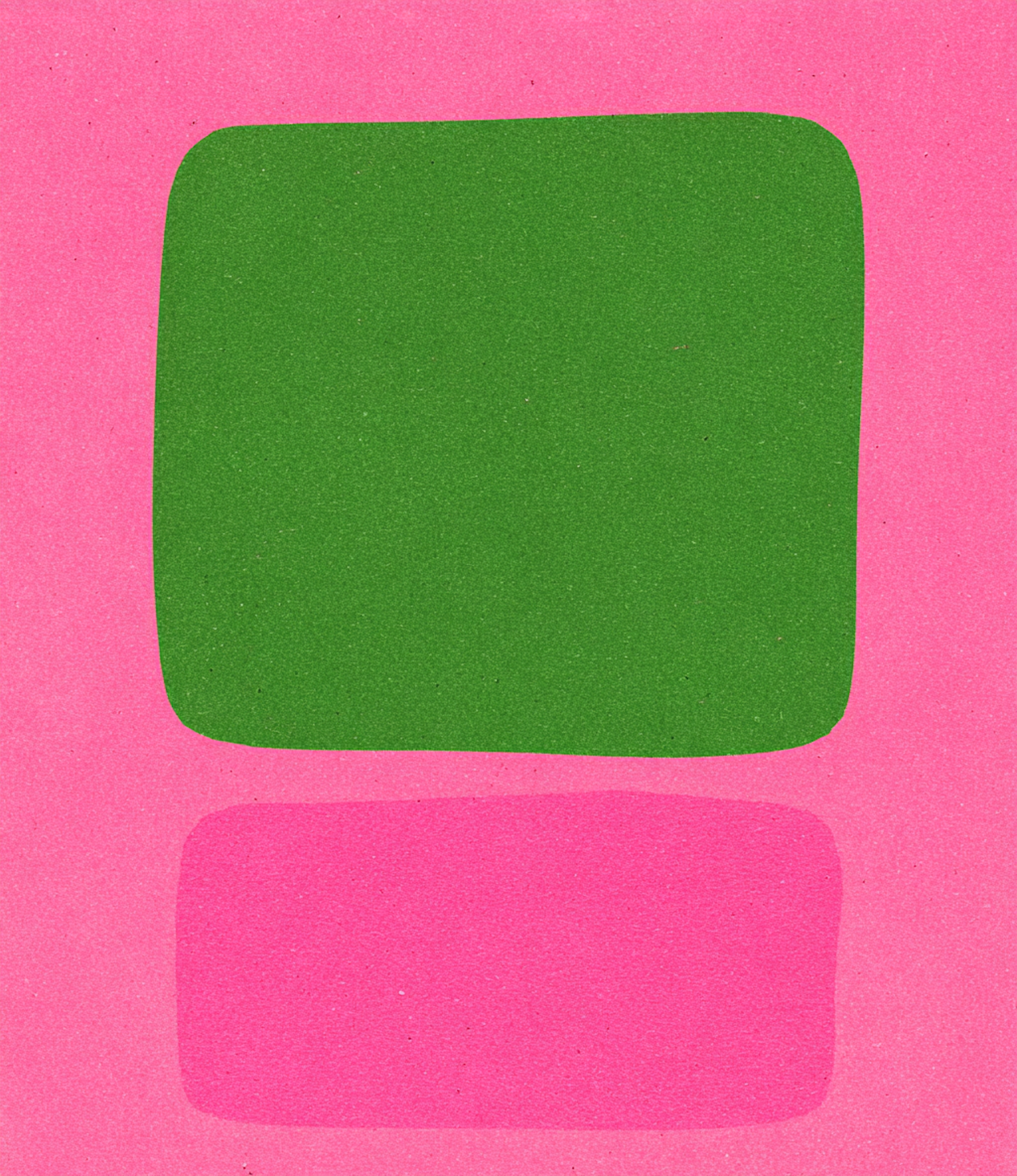 Abstract art with a green and pink geometric design on a vibrant pink background, showcasing bold contrasts and minimalist style.