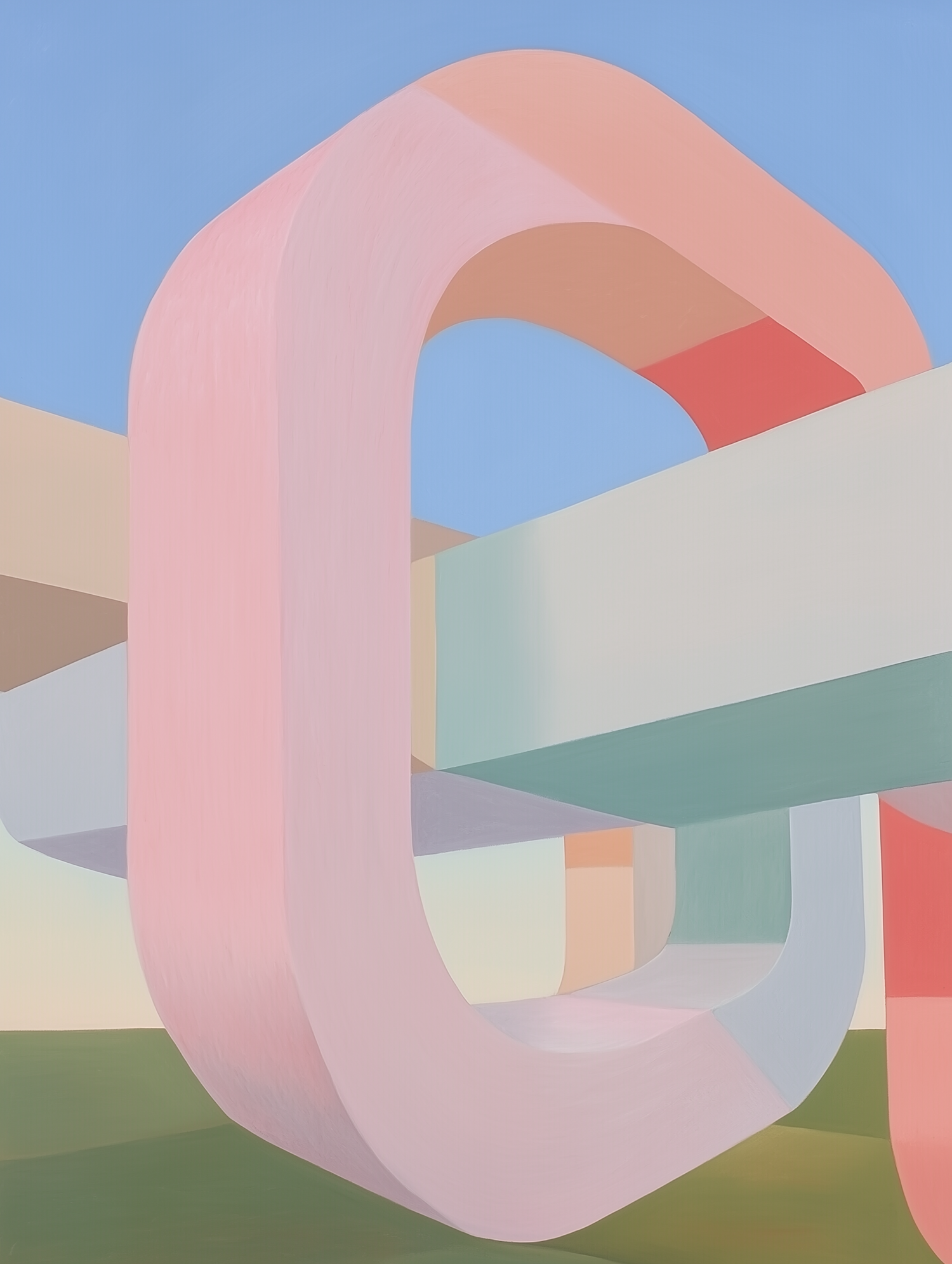 Abstract pastel-colored geometric shapes intersect under a clear blue sky, creating a serene and modern minimalist composition.