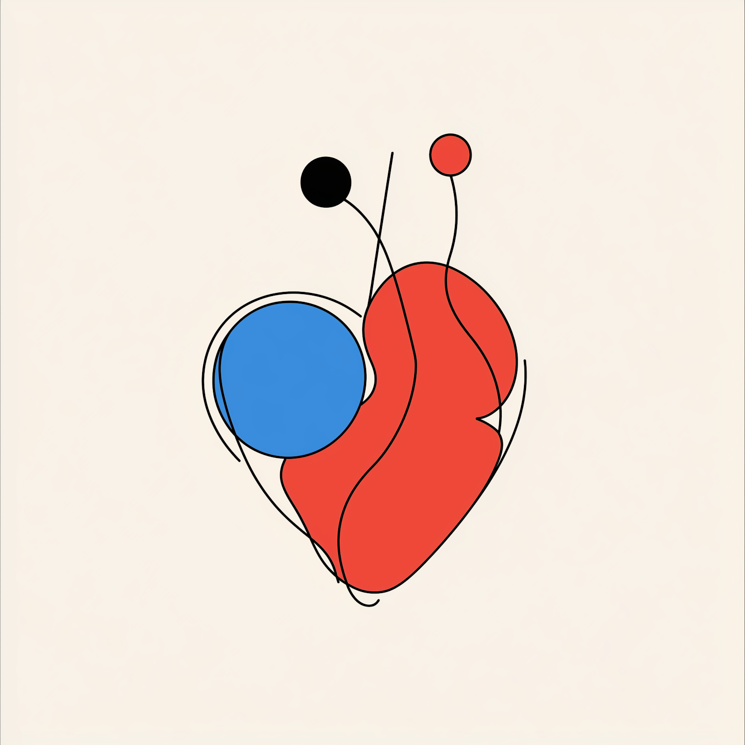 Abstract illustration with red and blue shapes, black lines, and circles on an off-white background. Minimalist and geometric design.