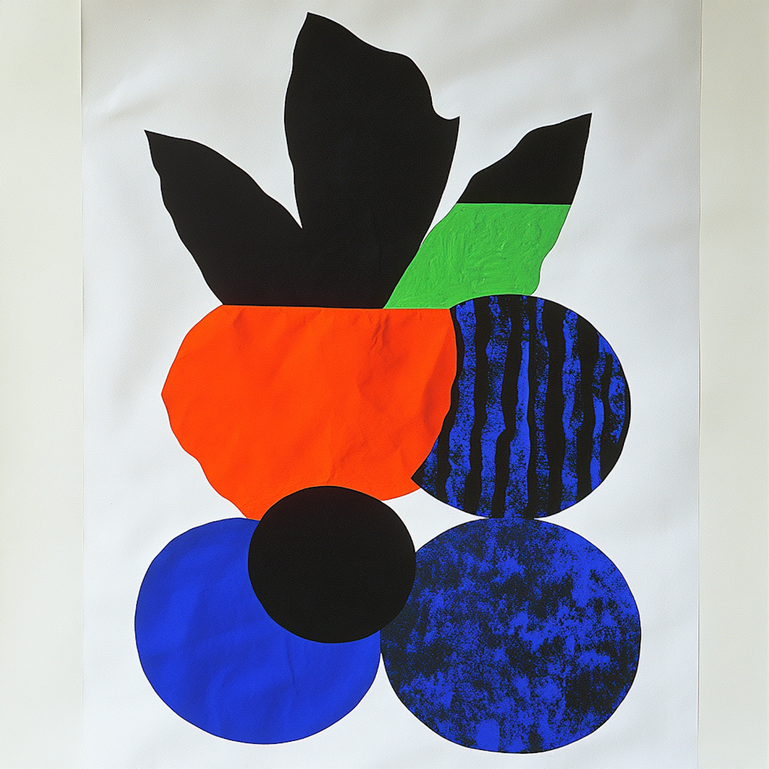 Bold abstract art with geometric shapes in orange, black, green, and blue on a white background. Vibrant and dynamic composition.
