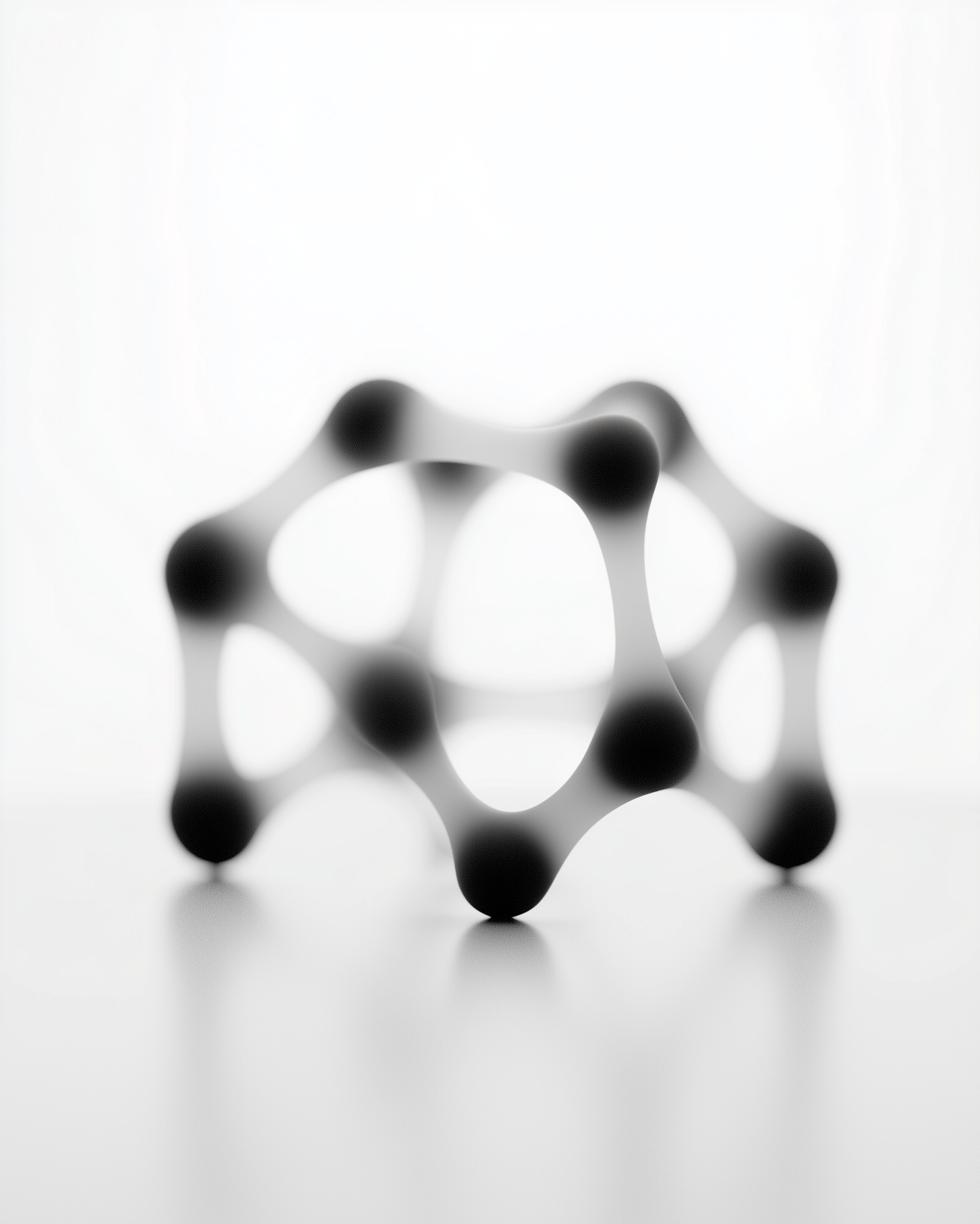 A contemporary design of a network-like structure with black spheres and translucent connectors on a minimal white background.