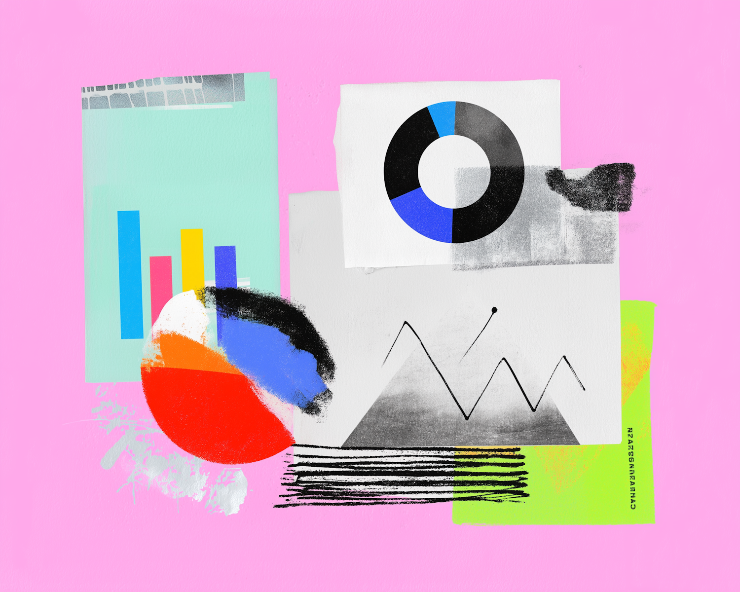 Abstract collage with colorful charts, shapes, and textures on a pink background, blending modern design and vibrant creativity.