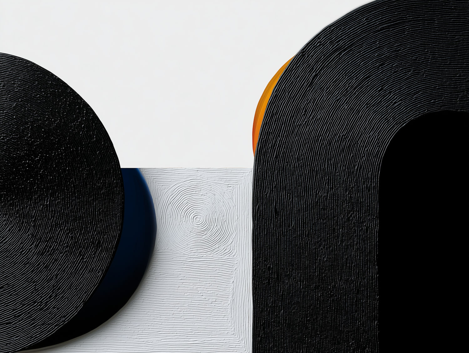 Abstract geometric artwork with bold black shapes, textured patterns, and hints of orange and blue on a white background.