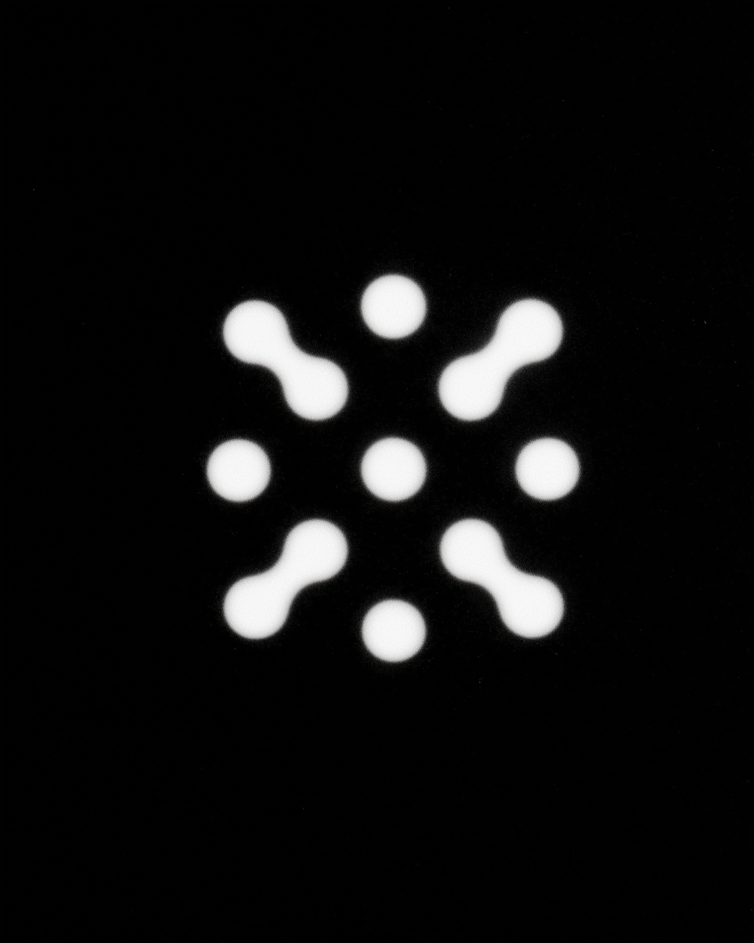 Abstract glowing white dots and lines on a black background, forming a symmetrical geometric pattern with a minimalist design.