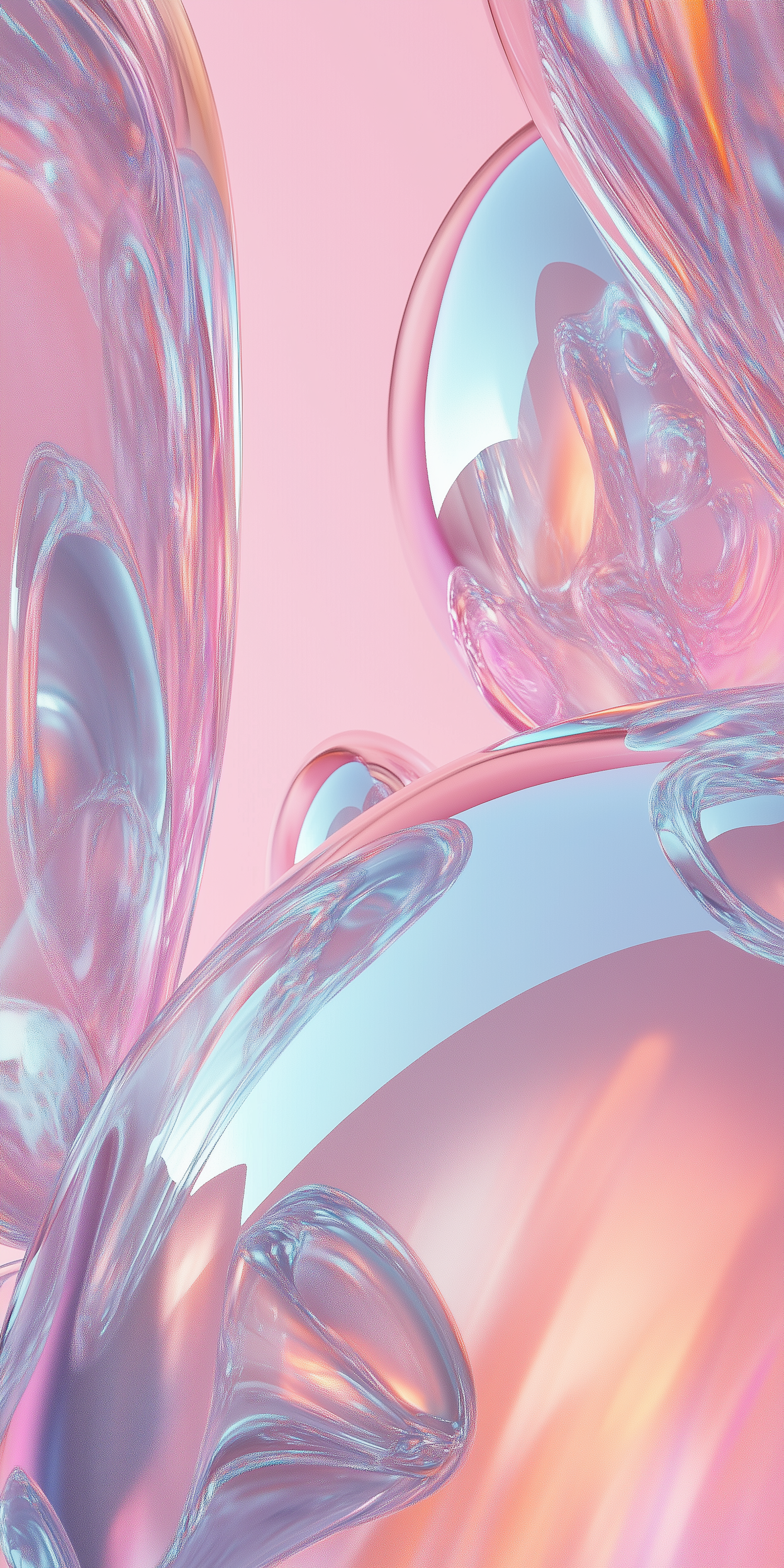 Abstract pastel bubbles with glossy, translucent textures in pink, blue, and orange hues. A dreamy, modern design with soft light reflections.