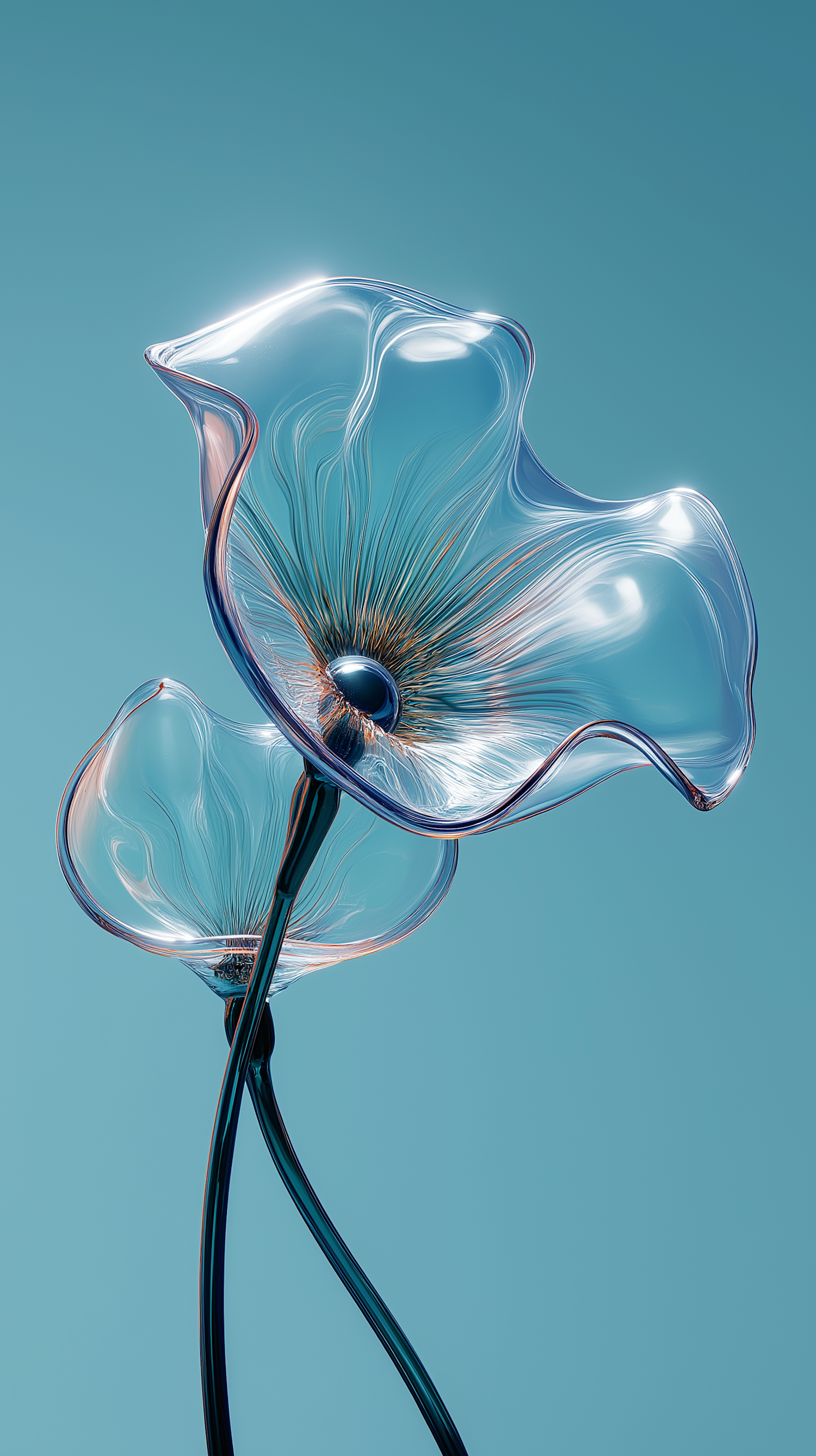 Abstract glass-like flowers with translucent petals and intricate details against a soft blue background, creating a surreal aesthetic.