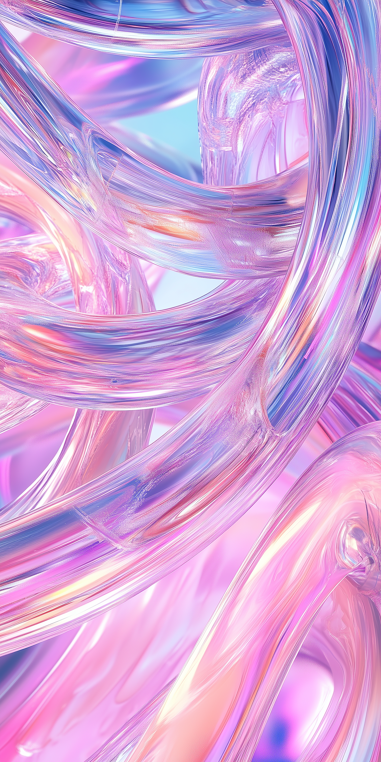 Abstract pastel artwork with glossy, translucent tubes in pink, purple, and blue hues, creating a dreamy and fluid visual effect.