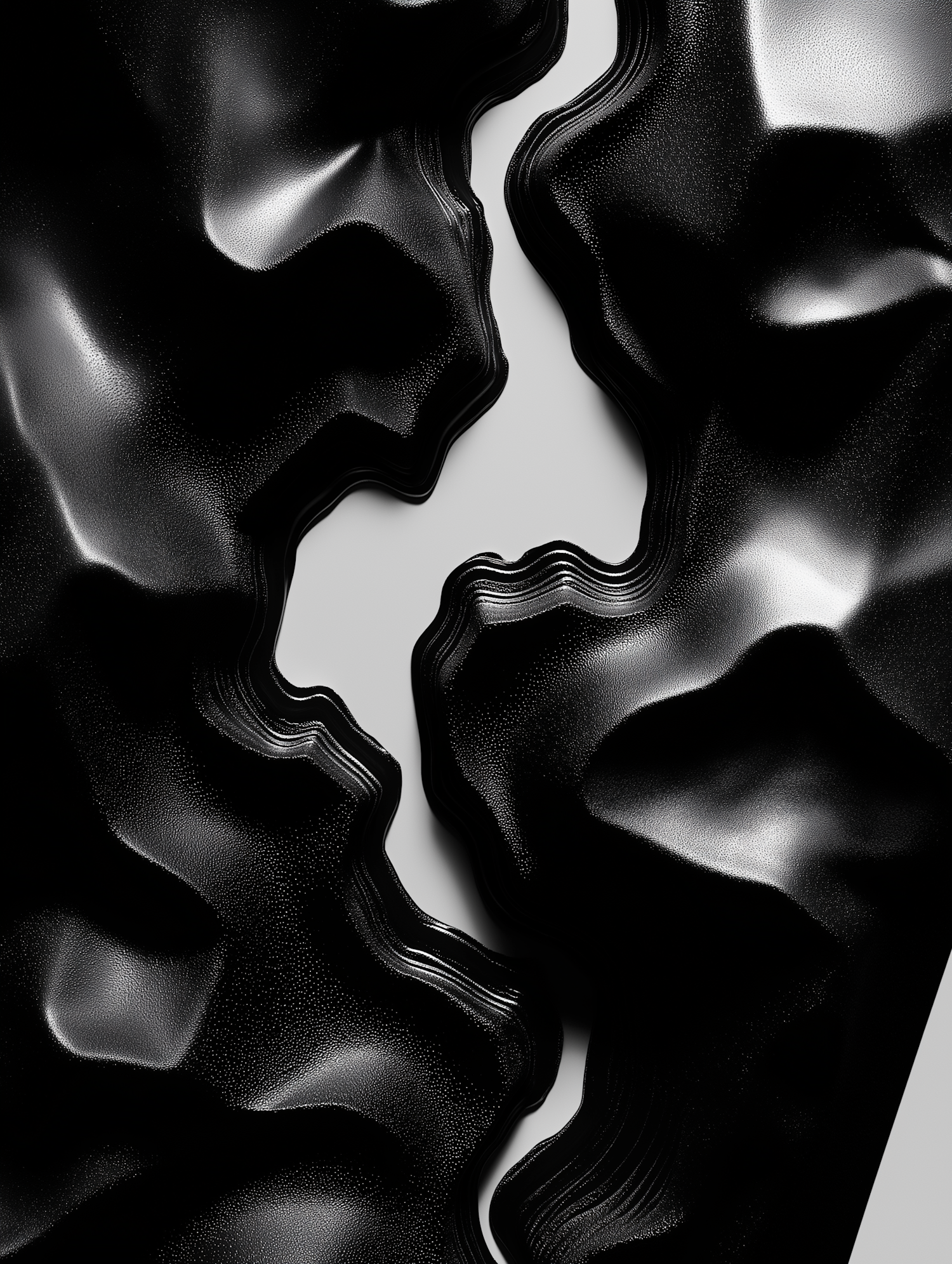 Abstract black glossy shapes with textured surfaces on a light gray background, creating a striking contrast and modern aesthetic.