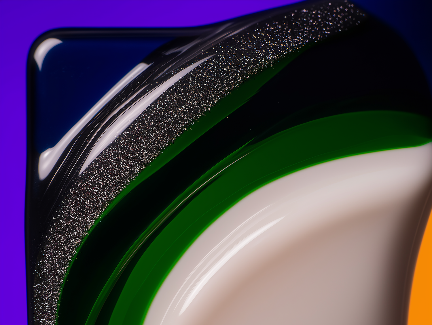 Abstract close-up of glossy, curved surfaces in green, black, and white with a gradient purple-orange background and speckled textures.