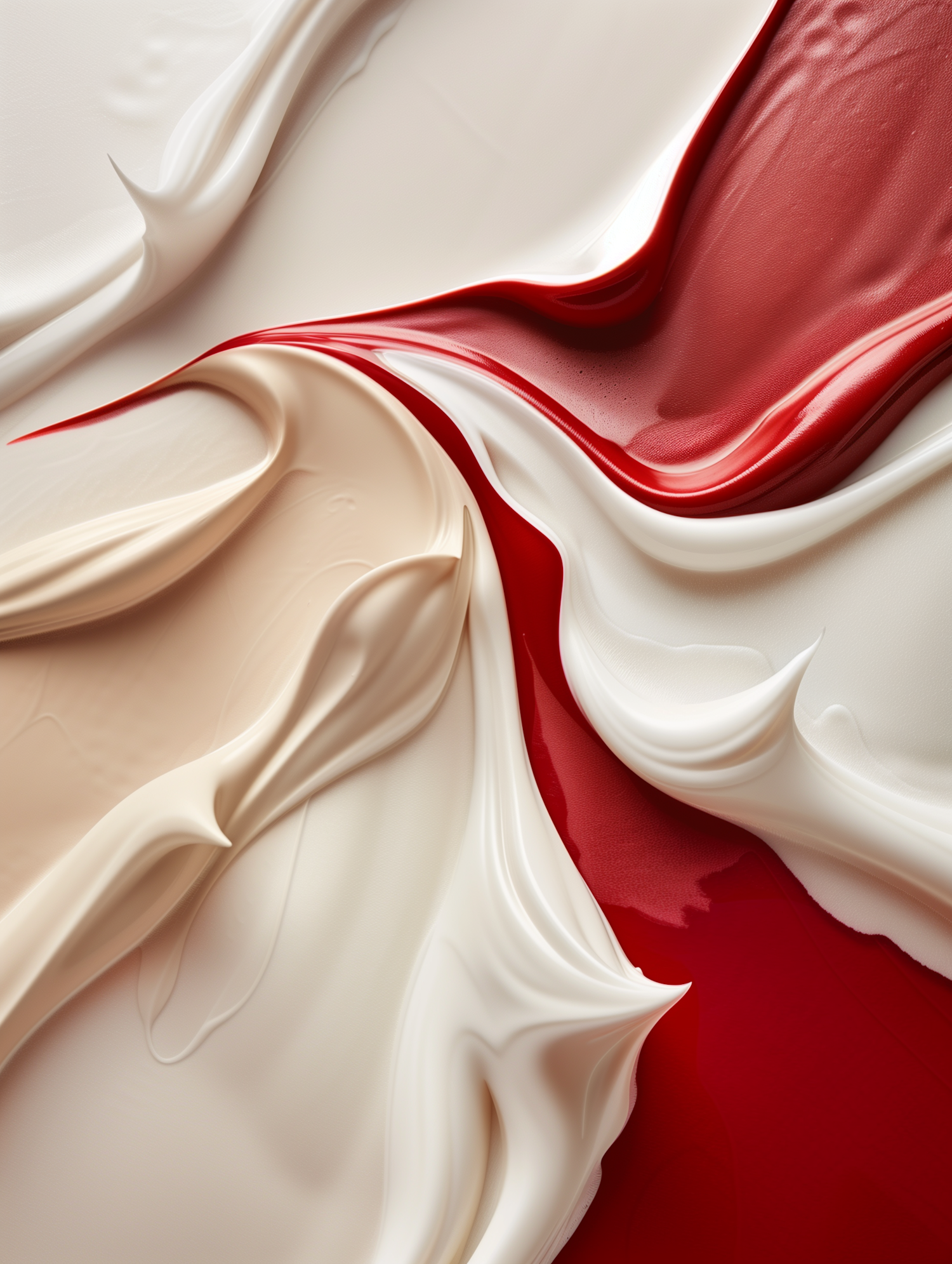 Abstract swirls of cream and red hues evoking textures of paint or cosmetics with smooth, flowing waves.