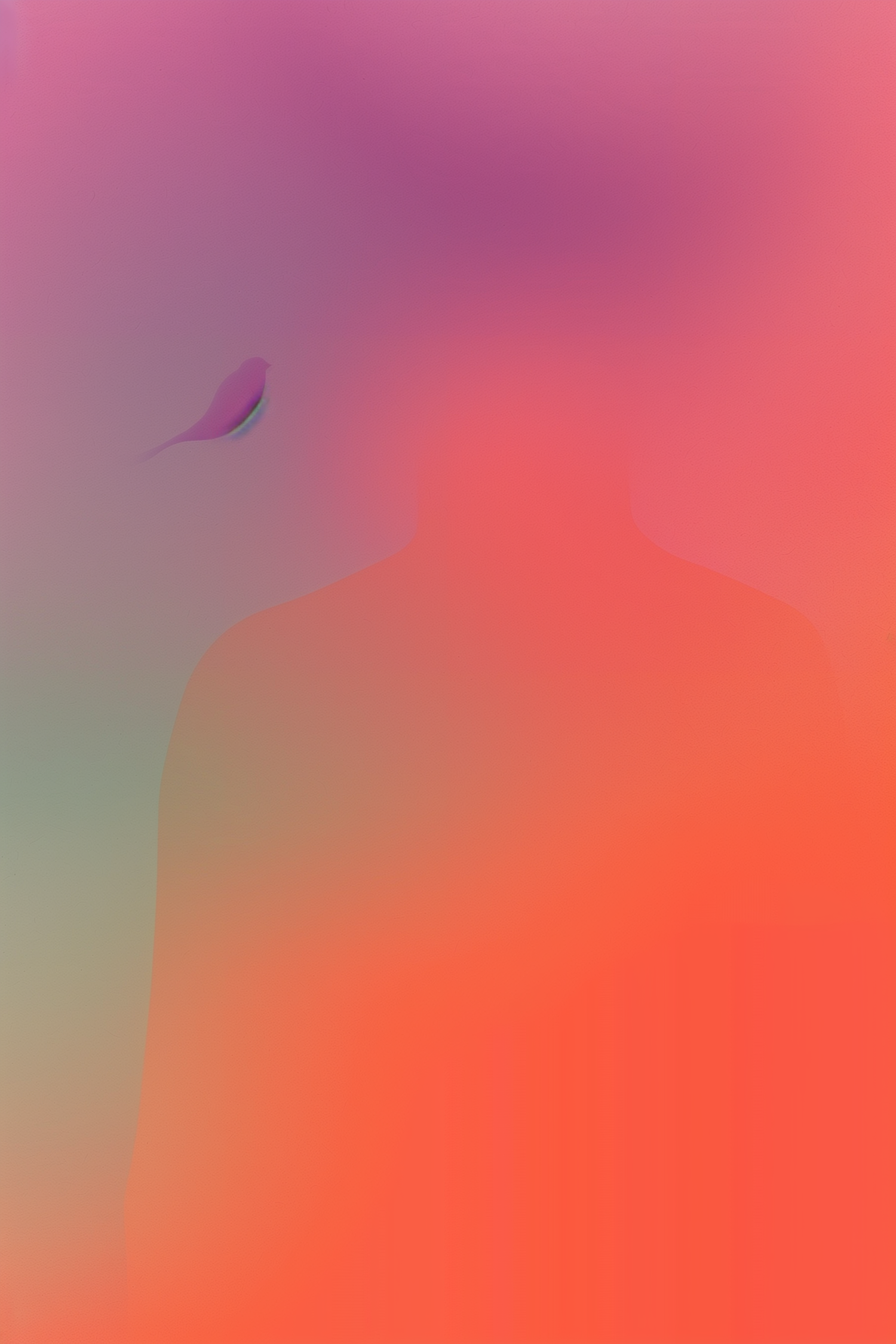 Abstract gradient art with a human silhouette and a bird-like shape, blending warm oranges and cool purples for a dreamy, ethereal vibe.