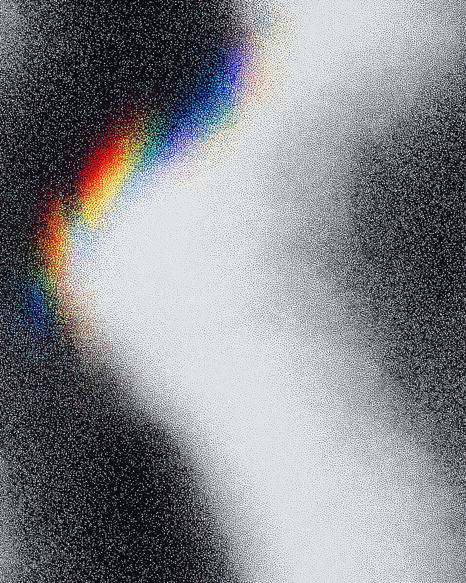 Abstract art featuring a grainy black and white backdrop with a vivid rainbow spectrum gradient on the left, creating a striking contrast.