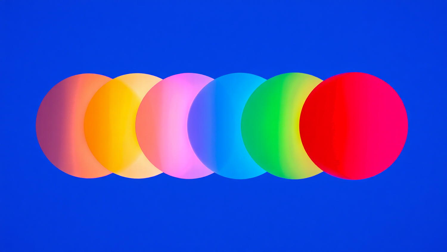 Abstract art with six colorful gradient circles on a bold blue background, blending warm and cool tones for a vibrant, modern look.