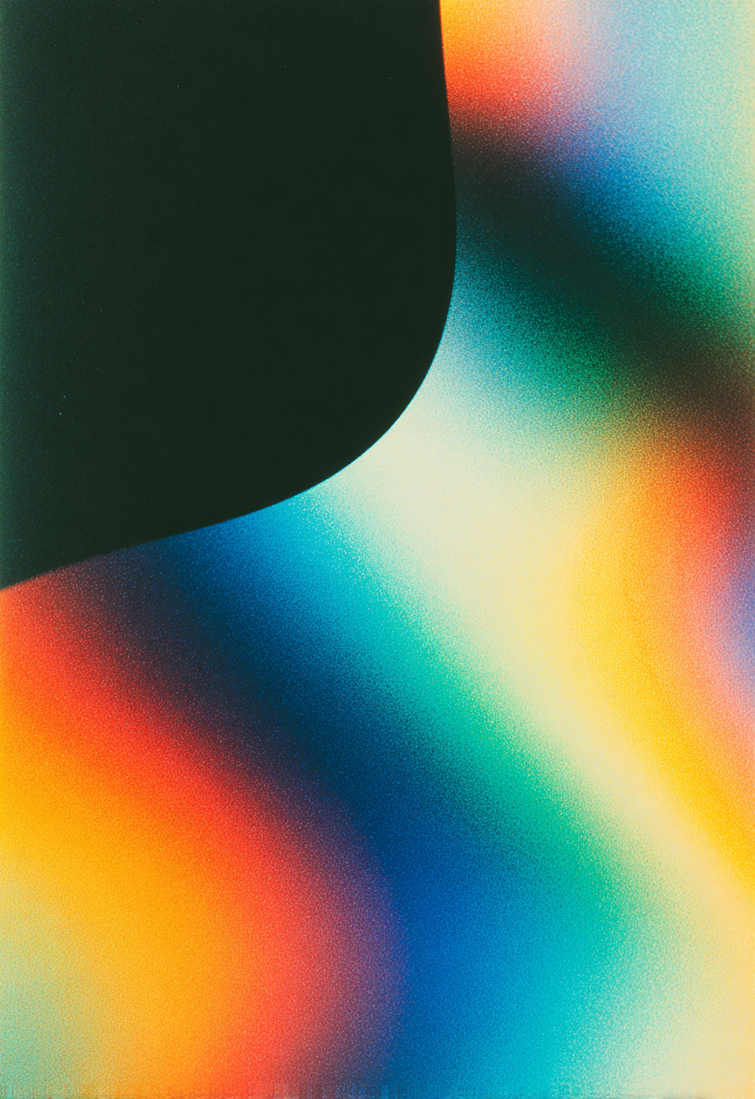 Colorful abstract artwork with vibrant gradients blending into a stark black shape, evoking a sense of bold contrast and dynamic flow.
