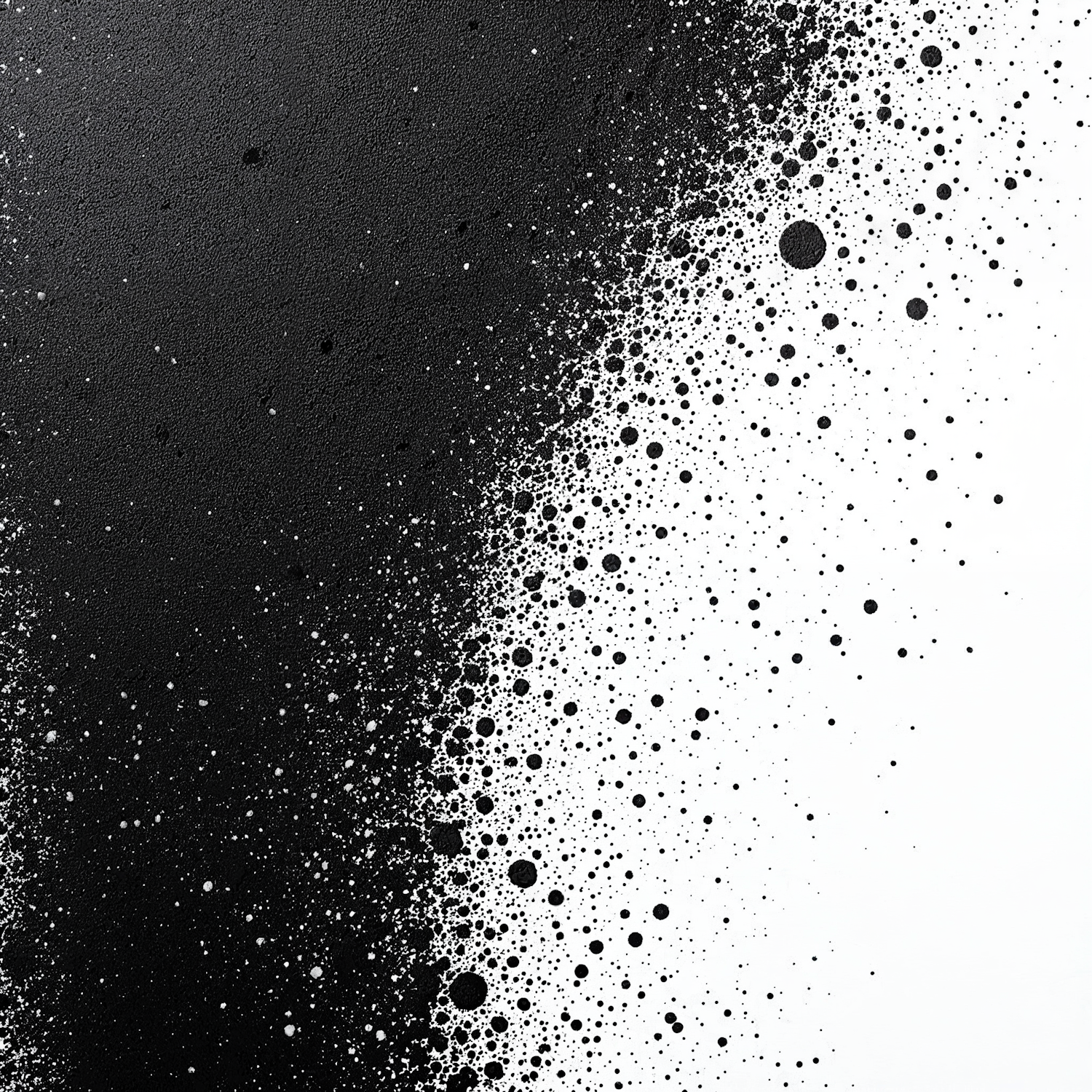 Abstract black-to-white gradient with dynamic splatter effect, blending textures and creating a bold, energetic visual transition.