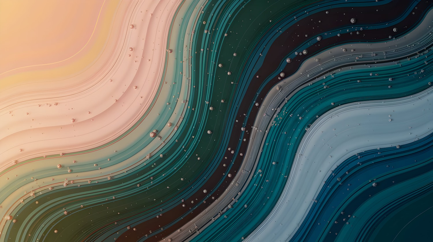 Abstract wavy lines in peach, teal, and black tones with scattered bubbles, creating a dynamic and serene visual flow.