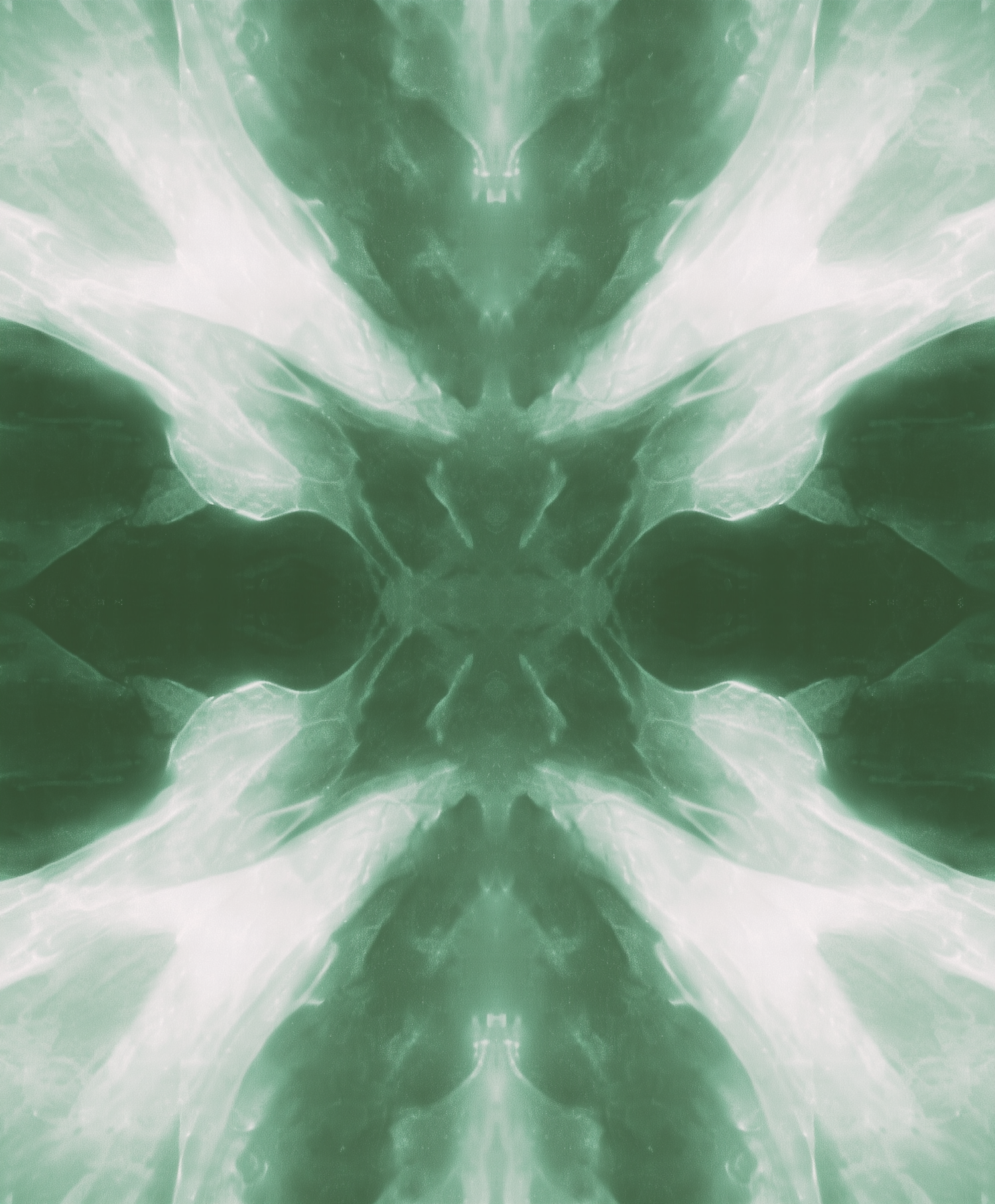 Abstract green and white symmetrical design with a kaleidoscopic pattern, resembling a butterfly or floral shape, creating an ethereal effect.