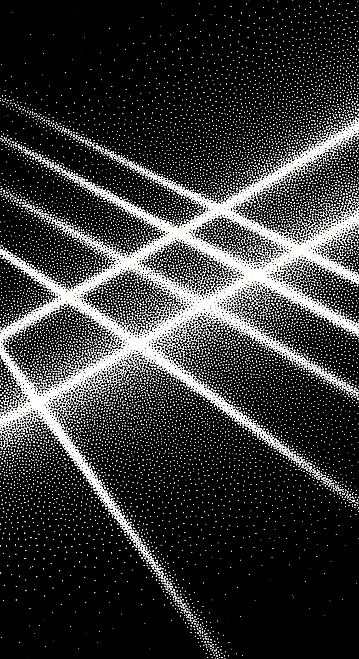 Abstract black and white artwork with intersecting lines and dots, creating a dynamic and textured geometric pattern.