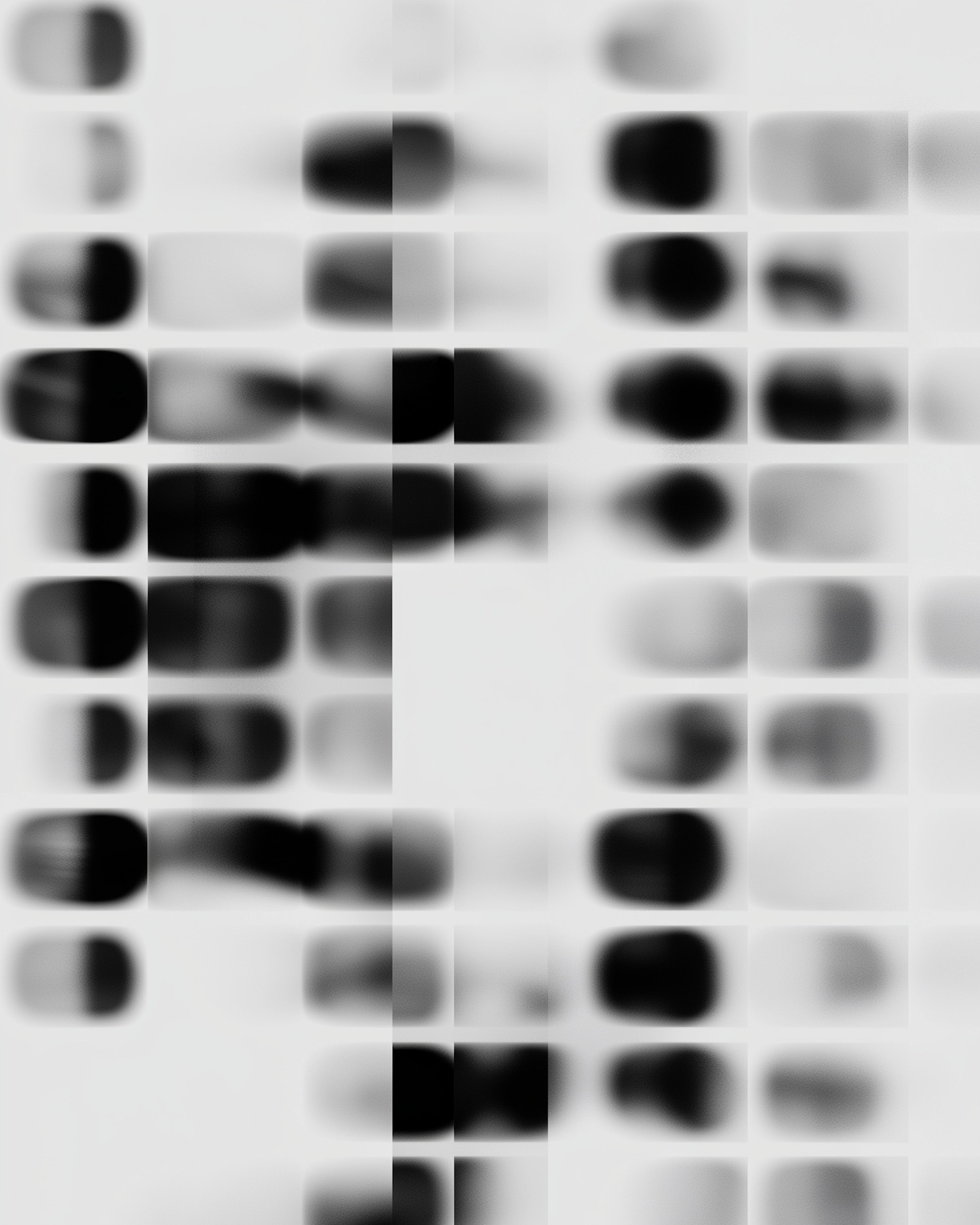 Abstract blurred grid pattern with black and gray shapes on a light gray background, creating a sense of depth and movement.