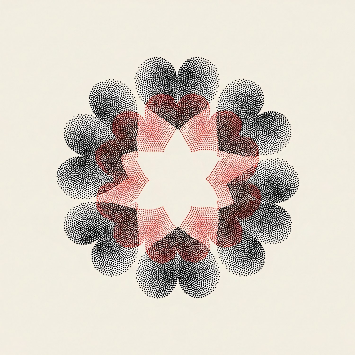 Abstract halftone design with a star and heart shapes in black and red on a beige background, creating a balanced and artistic composition.