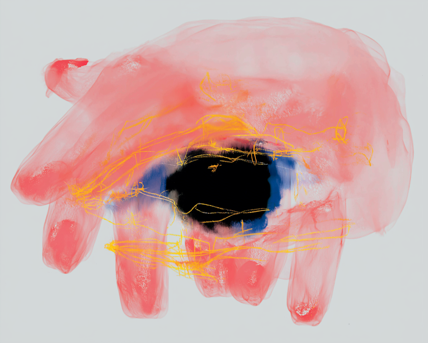 Abstract artwork of a hand-like form in pink with a dark void, accented by blue and yellow lines, on a light gray background.