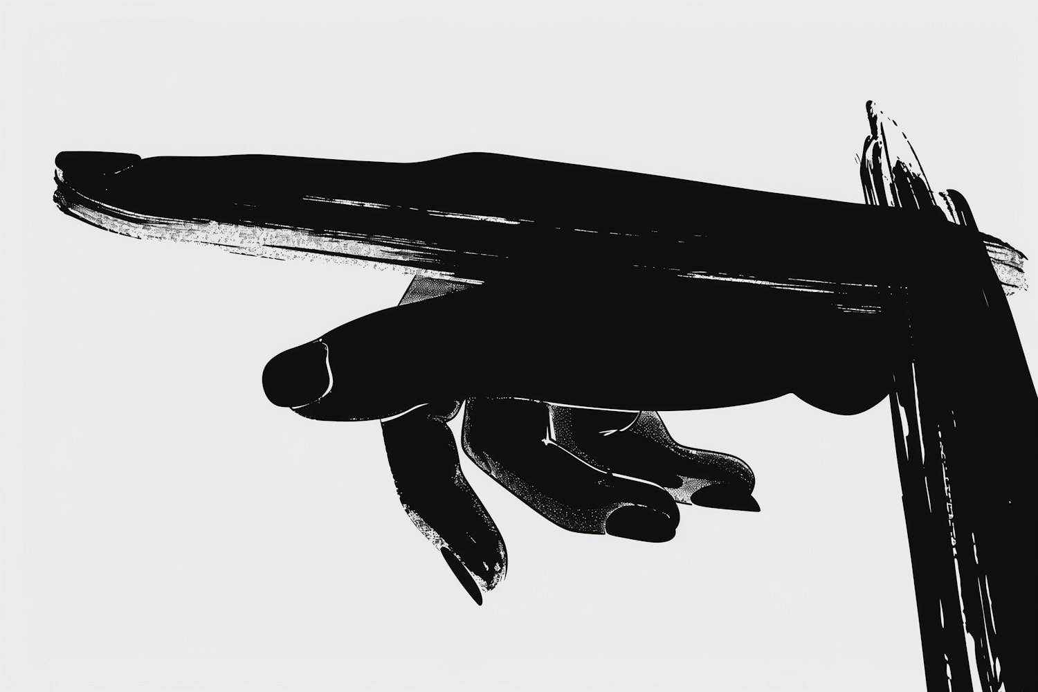 Abstract black and white illustration of a hand holding a pen or brush, with bold strokes and minimalistic design.