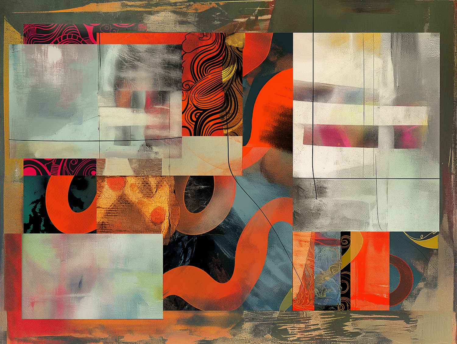 Vibrant abstract art with geometric shapes, swirling patterns, and bold colors like orange, red, and teal, creating dynamic contrast.